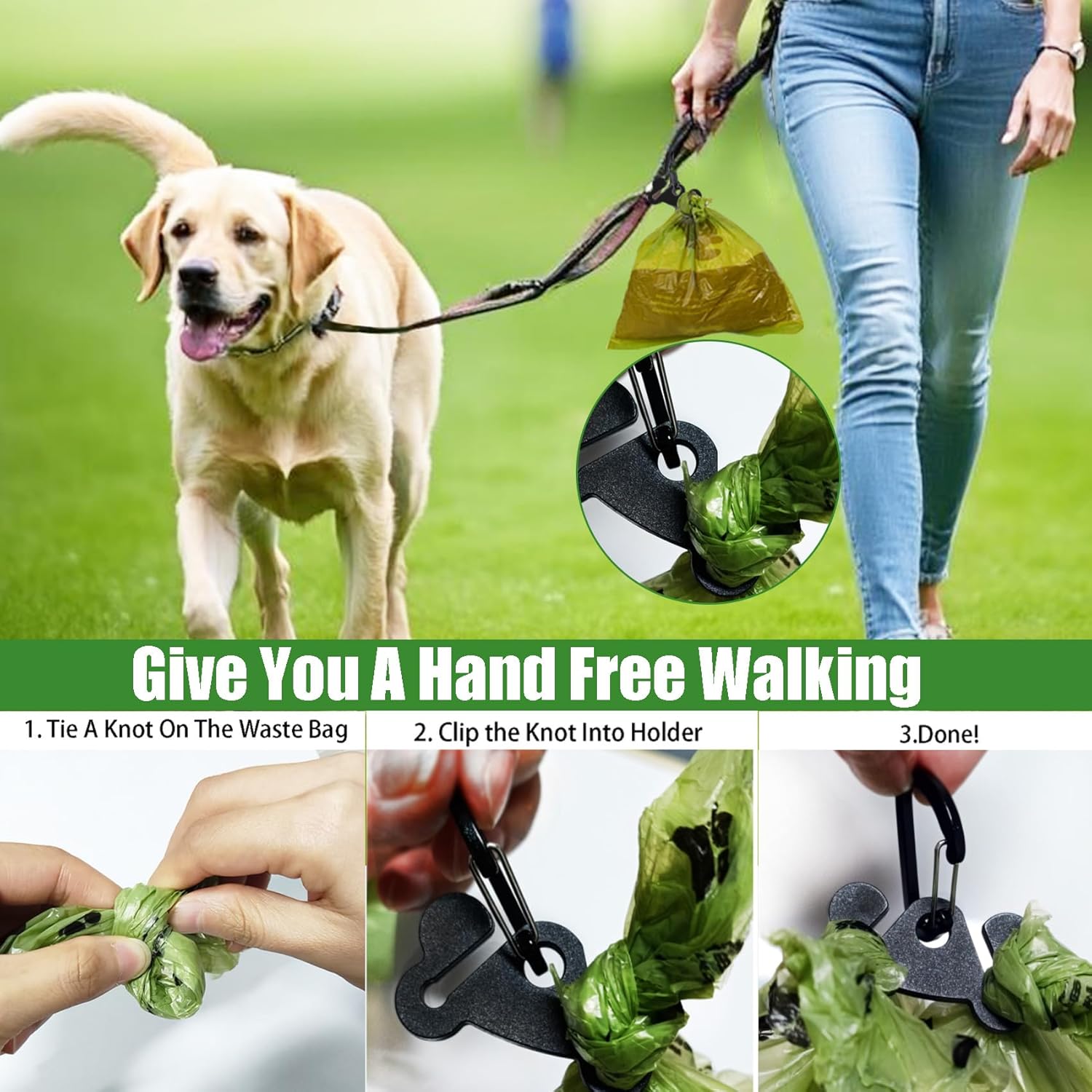 - HAND FREE WALKING SET - This practical set includes ONE Dog Poop Bag Dispensers, ONE Dog Poop Bag Holder & ONE Roll Waste Bag. A great leash attachment set for your dog walking. Enjoying hand free walking without holding wasted poop bag.