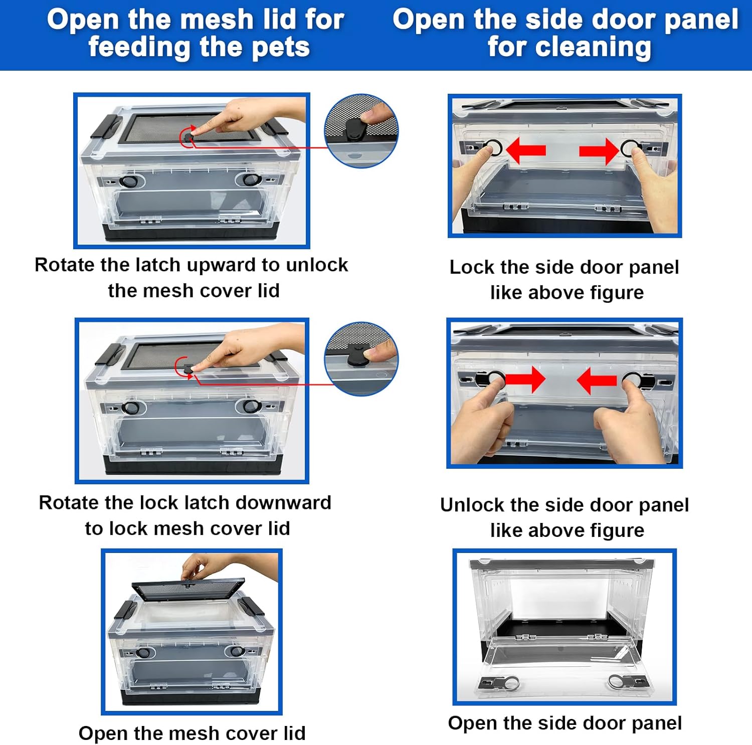 - 【Flexible opening and closing cover and side door】The top mesh lid can be opened and closed for better air flow and easy pet feeding;The Front panel can be opened and closed for easy cleaning of pet house
