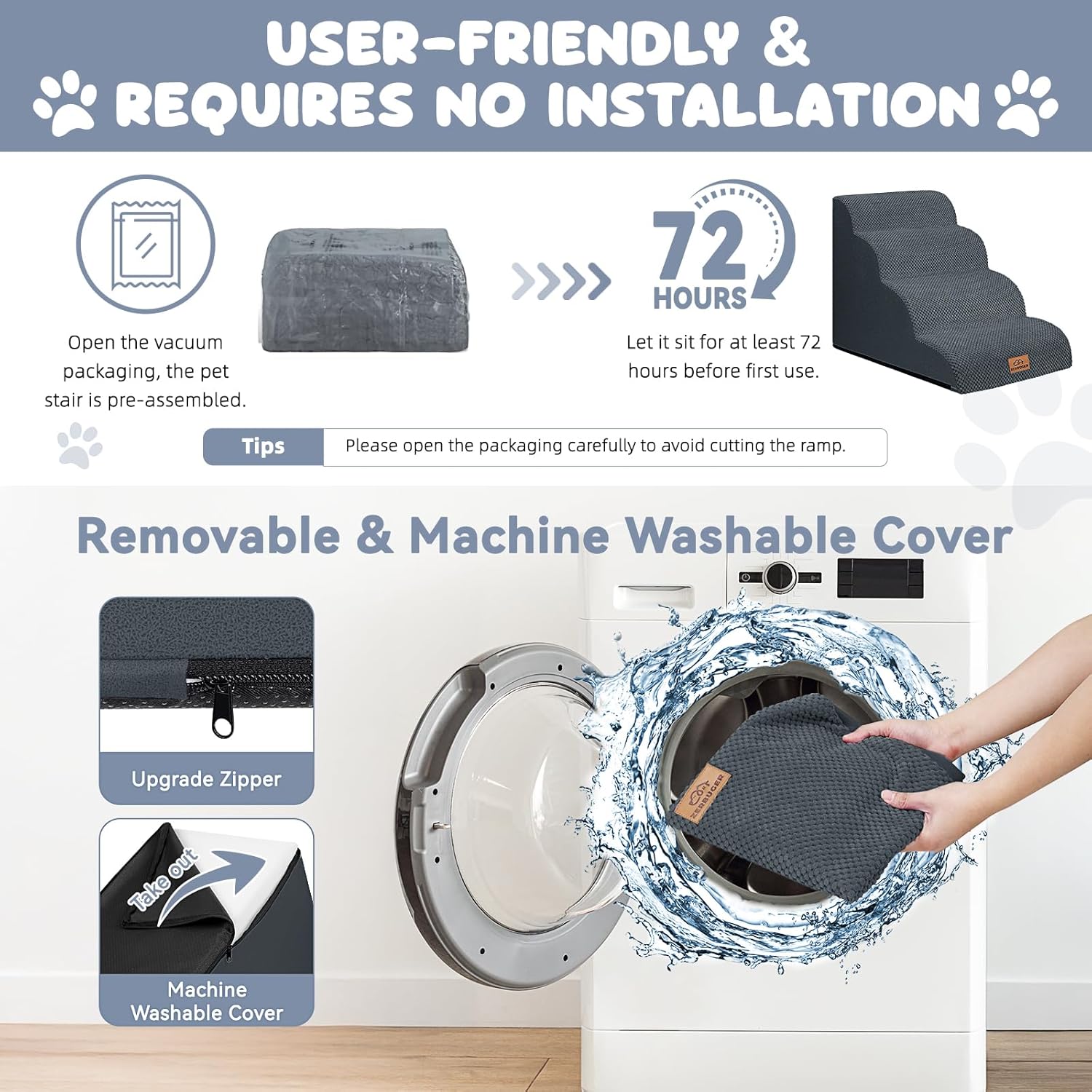 - No Assembly Required & Easy to Clean: When you open the packaging, the pet stair is already assembled. Before the first use, it should be left standing for at least 48-72 hours for the foam to fully expand. NOTE!! Open the packaging carefully to avoid cutting the stair! The outer cover can be removed for cleaning and supports machine washing or hand washing. Please note that the inner foam is not washable.