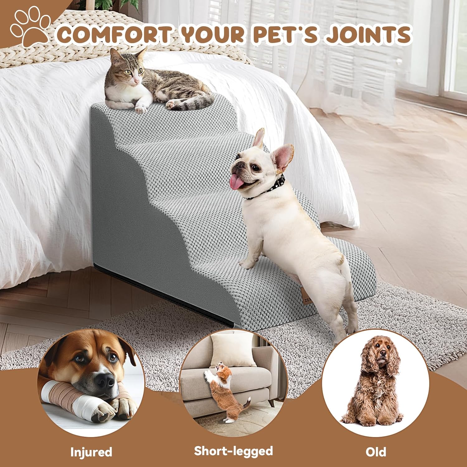 - Specific & Durable Design: Low angle slope design reduces the pressure on joints when pets jump up and down from high bed, sofa, chair and car. Portable handle makes moving stairs easily at home or taking a trip with your pet. The non-slip bottom keeps the stair firmly planted on the ground. No more worrying about your pet slipping and getting hurt! Our foam stair is an essential part of your beloved pet's life! It combines functionality, safety, and durability in one stylish package!