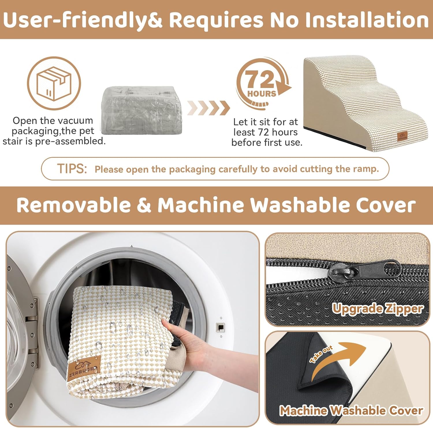 - No Assembly Required & Easy to Clean: When you open the packaging, the pet stair is already assembled. Before the first use, it should be left standing for at least 48-72 hours for the foam to fully expand. NOTE!! Open the packaging carefully to avoid cutting the stair! The outer cover can be removed for cleaning and supports machine washing or hand washing. Please note that the inner foam is not washable.