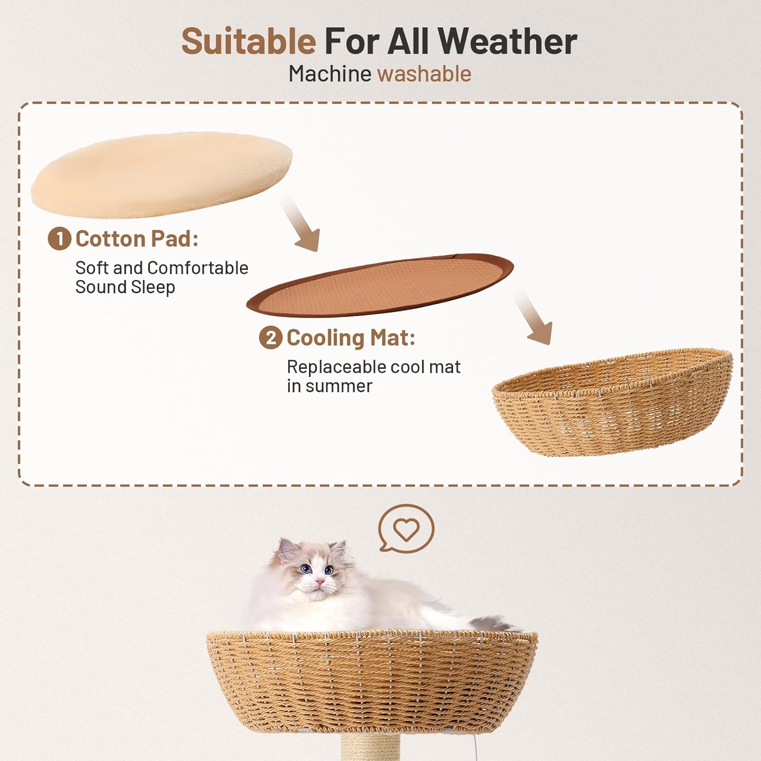 • All-Season Comfort for Your Cat:This cat tree tower features a breathable woven basket with two plush, machine-washable cushions—perfect for cozy naps year-round. In summer, switch to the cooling mat for a fresh, airy feel. Your indoor cats will love lounging in this ventilated hideaway, ensuring comfort in every season