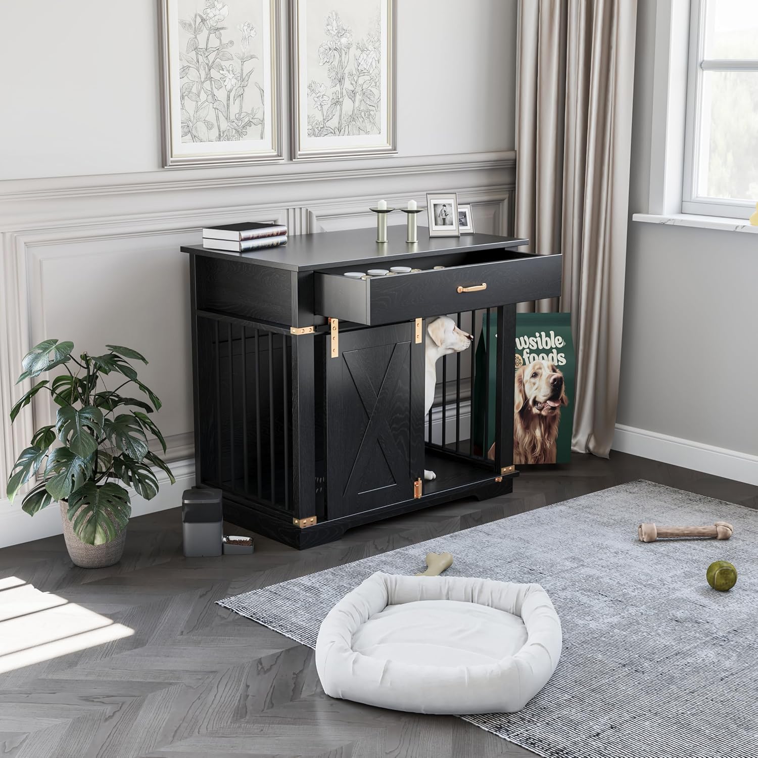 - Convenient Storage & Space-Saving Design: Equipped with a practical drawer storage area, this dog crate helps you organize your pet’s toys, food, and essentials neatly. The sliding barn door design ensures easy access while saving space, making it a perfect fit for any room.