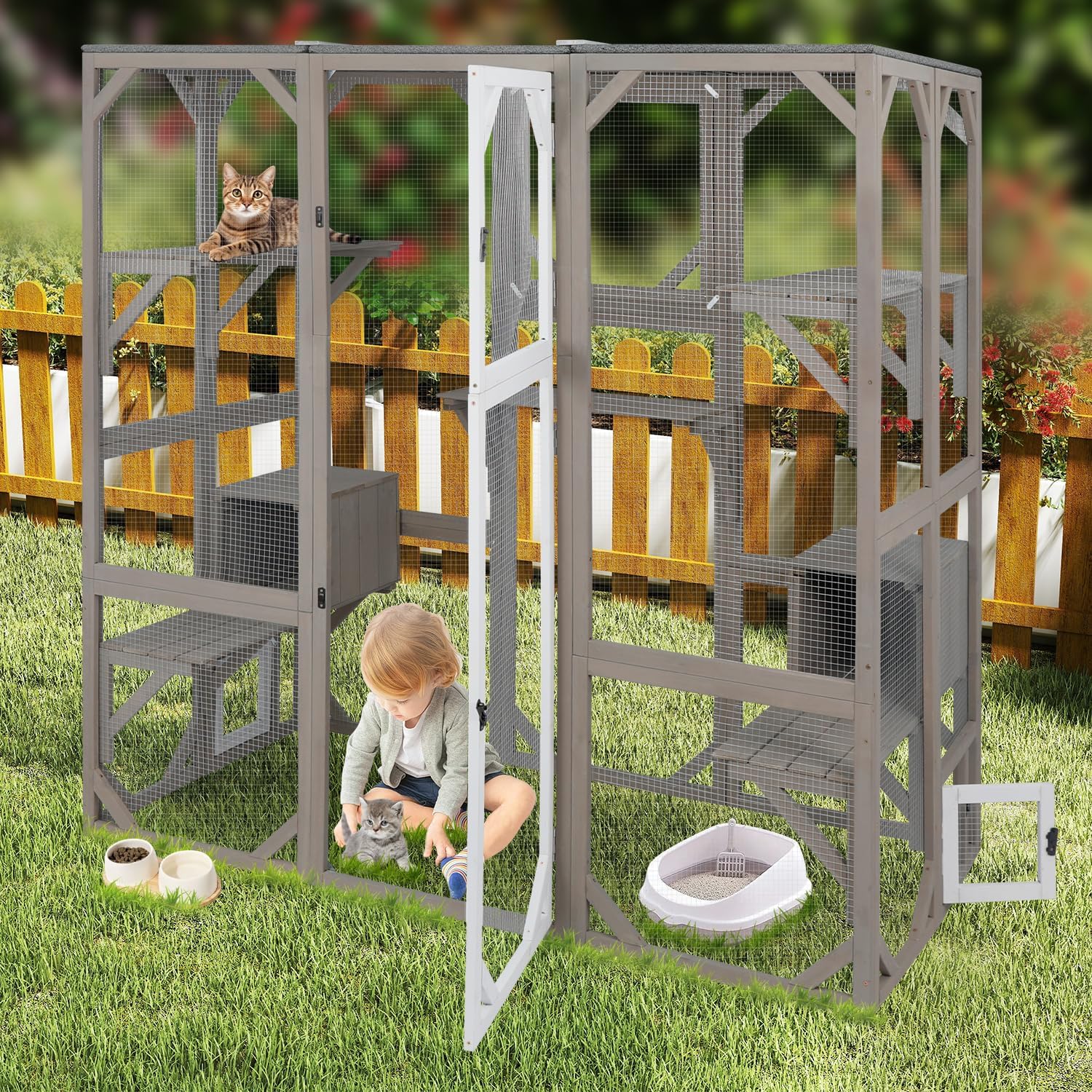 Catio Outdoor Cat Enclosure Cat House, Large Wooden Walk-in Cat Cage Condo Indoor Playpen with Multi Platforms, Flat Roof, and 2 Resting Box (Grey, 70.9" L x 36.5" W x 70.9" H)