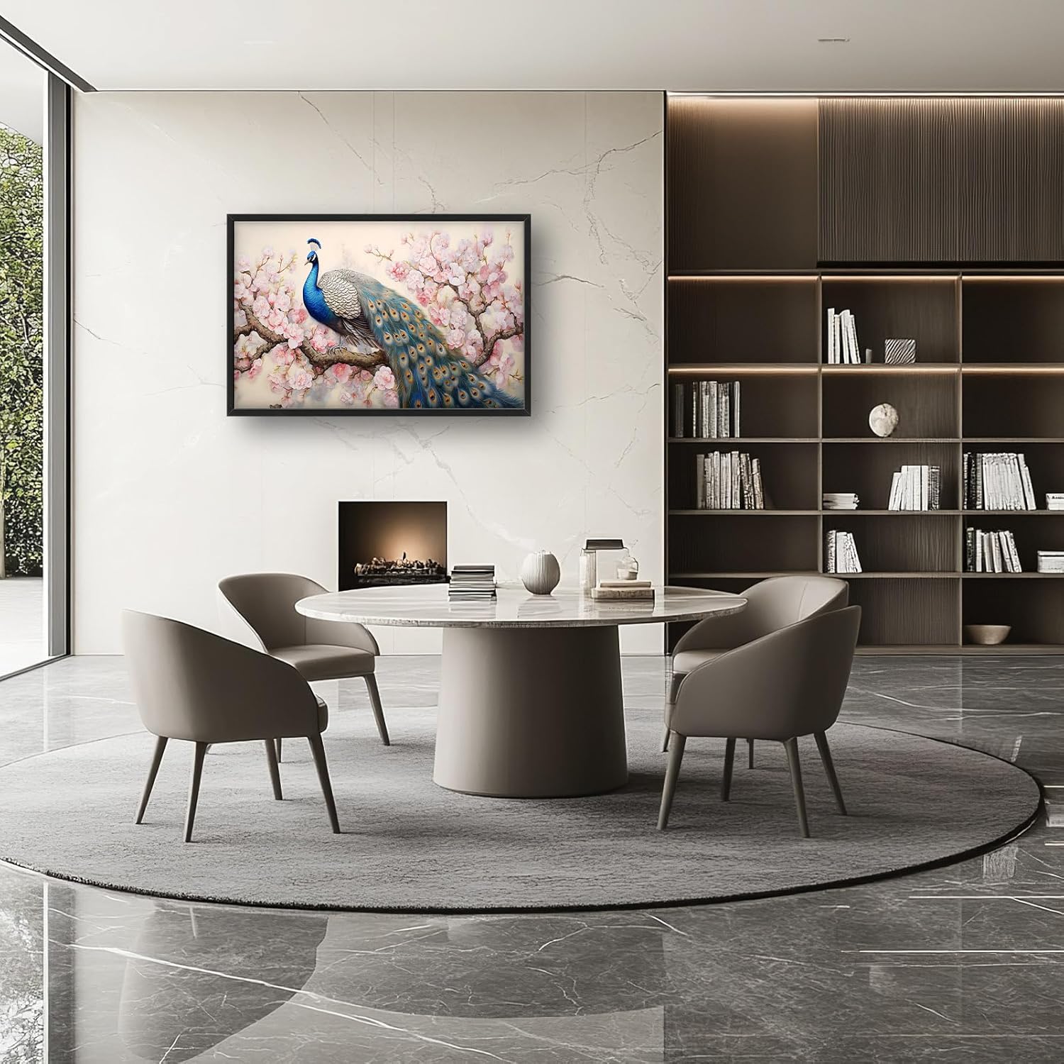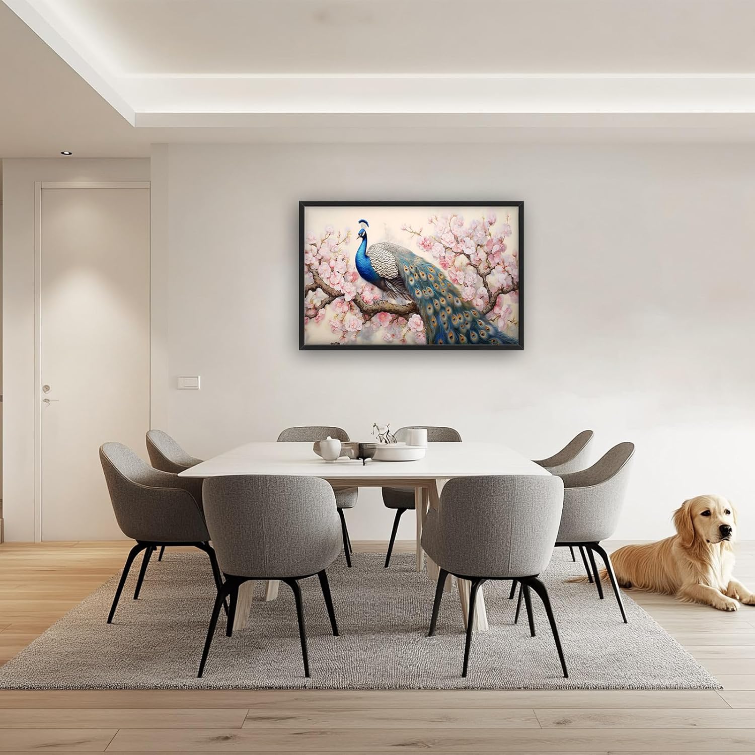 - 【Unique Design】A blue peacock with a long tail perched on the branch of a cherry blossom tree. The delicate brushstrokes capture the pink and white flowers in full bloom, with soft lighting and elegant colors. The intricate details of the peacock's highly detailed feathers are rendered with precision in this high-resolution work.