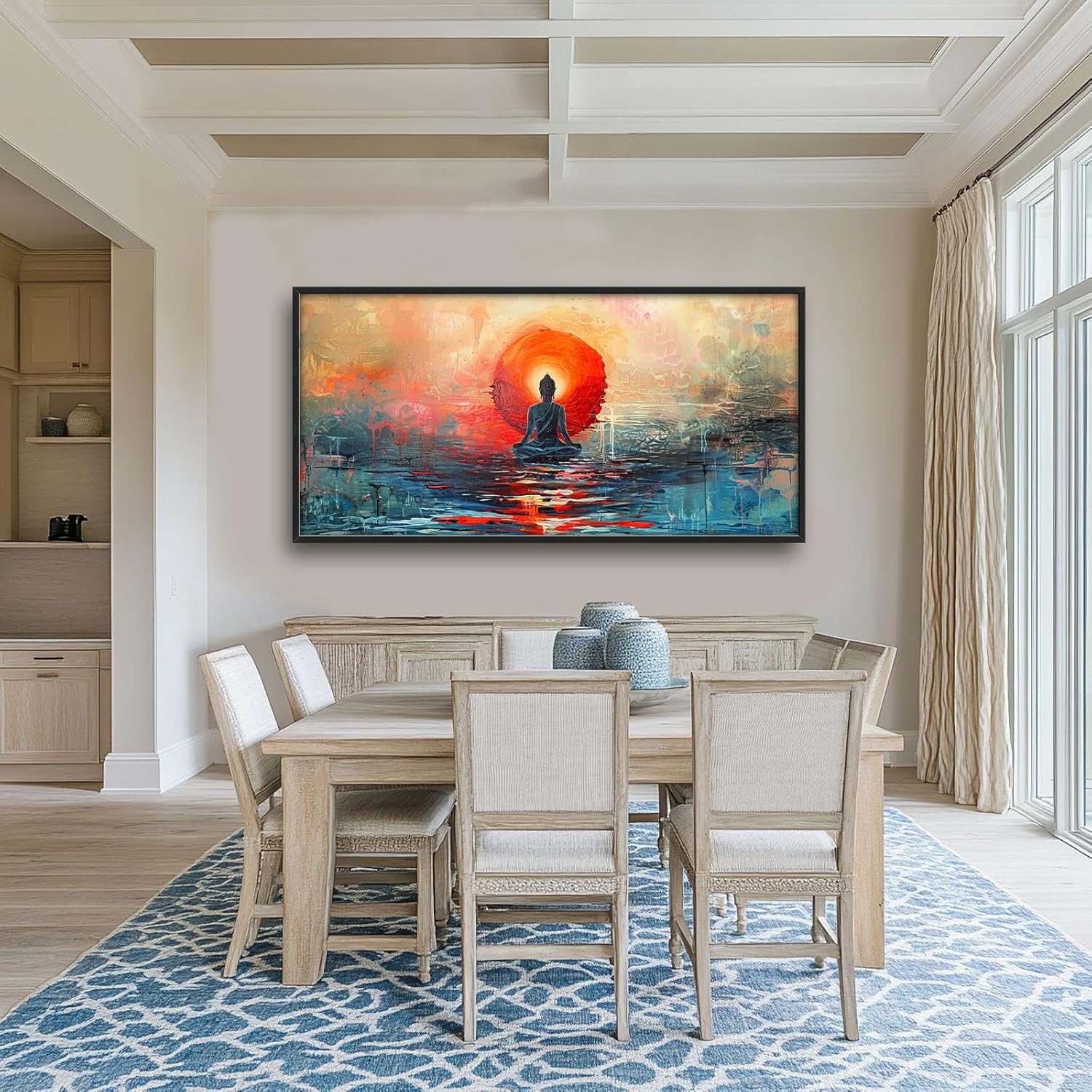 - 【Unique Design】The oil painting depicts Buddha meditating in the lotus position, with his back to the viewer and the rising sun behind him. A lake below reflects its surroundings and ripples in the water can be seen.