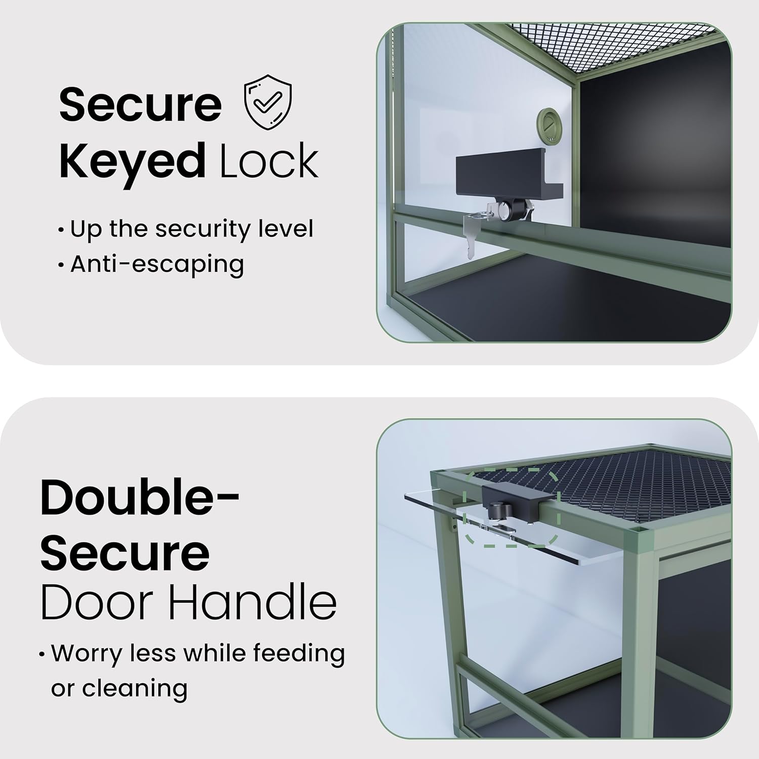- ăLock IncludedăA tempered glass door with a safety keyed lock to prevent escape and accidental opening by others. NO GAPS FOR ESCAPING with fully closed structure. Rigid tempered glass doors for extra safety.
