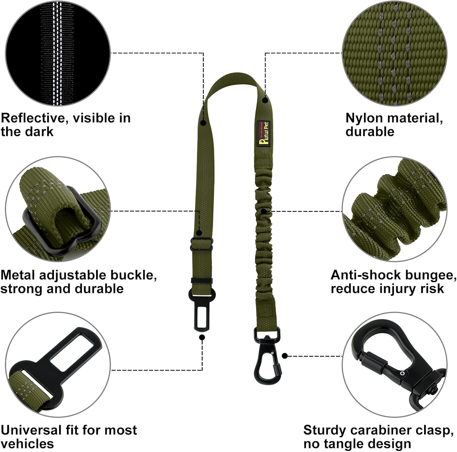 Plutus Pet Dog Seat Belt for Car, Adjustable Dog Car Harness with Carabiner Clip, Reflective Safety Dog Seatbelt Leash with Elastic Bungee, Ranger Green