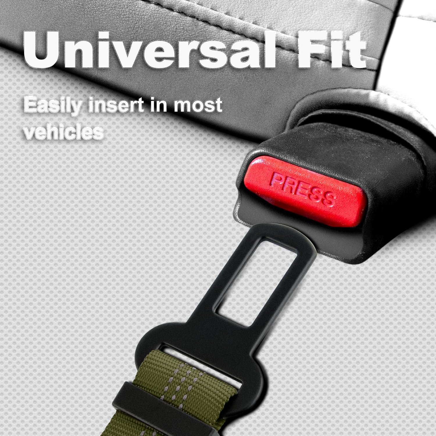 - Universal Buckle for Wide Vehicle Compatibility. Our seat belt features a universal buckle that fits most car models, ensuring hassle-free compatibility. Enjoy the convenience of using the same reliable seat belt across different vehicles. In an emergency, this seatbelt can be used as a dog leash, and the reflective strips increase visibility, making your dog easily noticeable in low-light conditions for added safety.