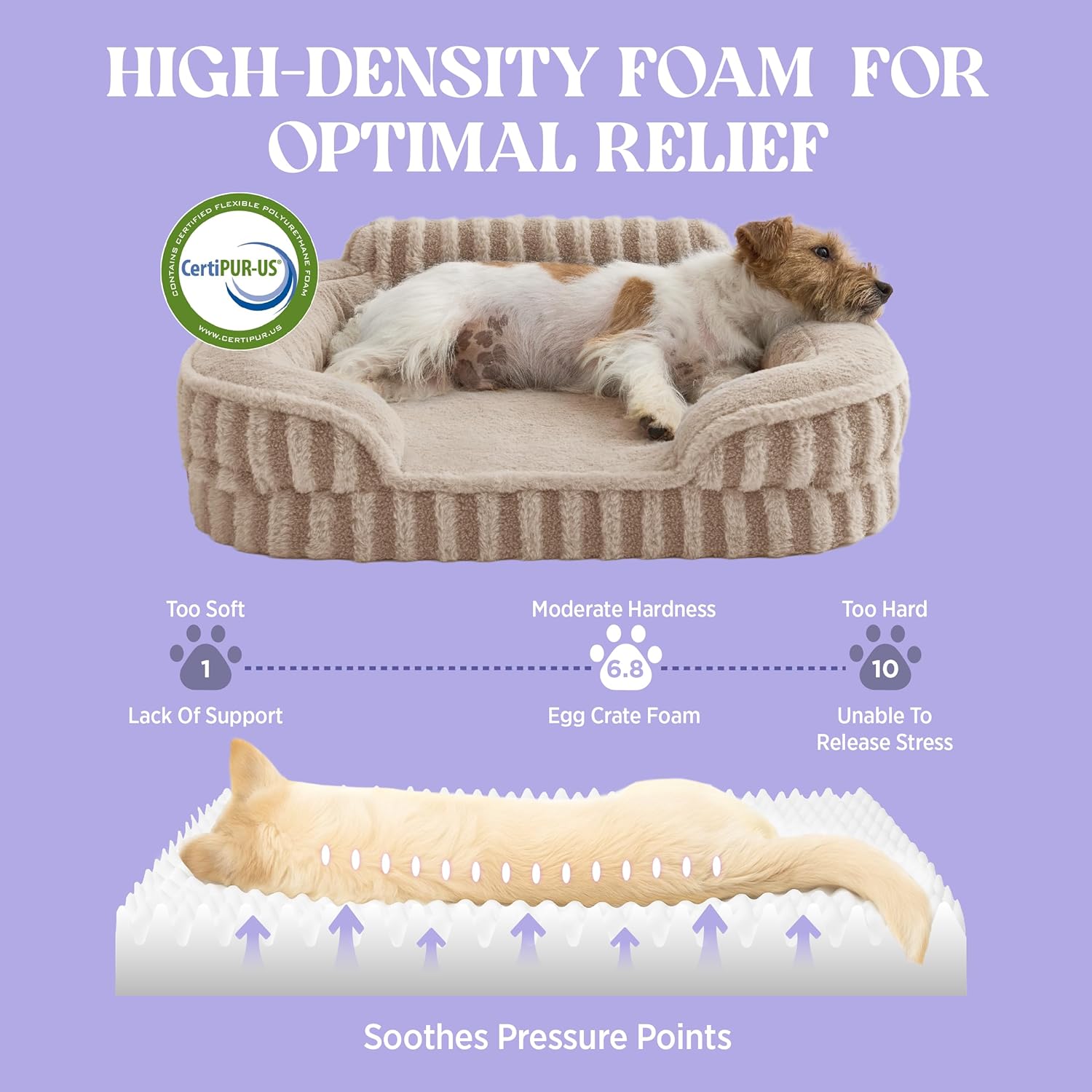 - Plush Comfort:Designed with thick egg crate foam that provides gentle, orthopedic support to relieve pressure on aching joints. This dog sofa is wrapped in an ultra-soft faux fur outer layer that creates a warm, soothing surface your pet will love to curl up on.