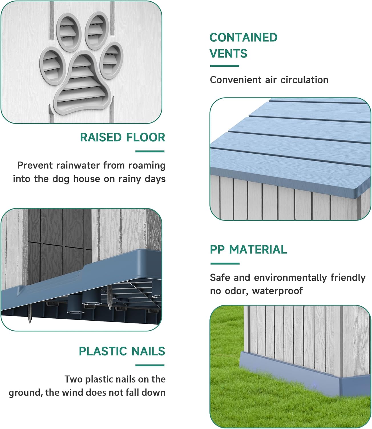 - Sturdy and Durable: This big dog house is made of high quality PP (polypropylene) material, which is extremely durable.The PP material is scratch-resistant, abrasion-resistant, and also waterproof. It can withstand all kinds of weather conditions, such as rain and sunlight exposure, and is not easily damaged.