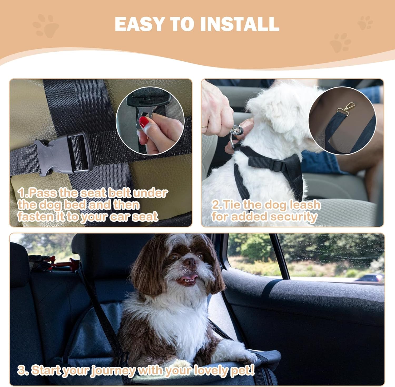 • [Premium Leather Dog Car Seat]: This dog car seat is made from high-quality leather, which is wear-resistant and scratch-resistant, and very durable. The interior is filled with pp foam to enhance cushioning. The adjustable lock on the back and the reserved seat belt position can firmly fix this pet car booster seat to the car seat, improving the safety of the dog during car driving.