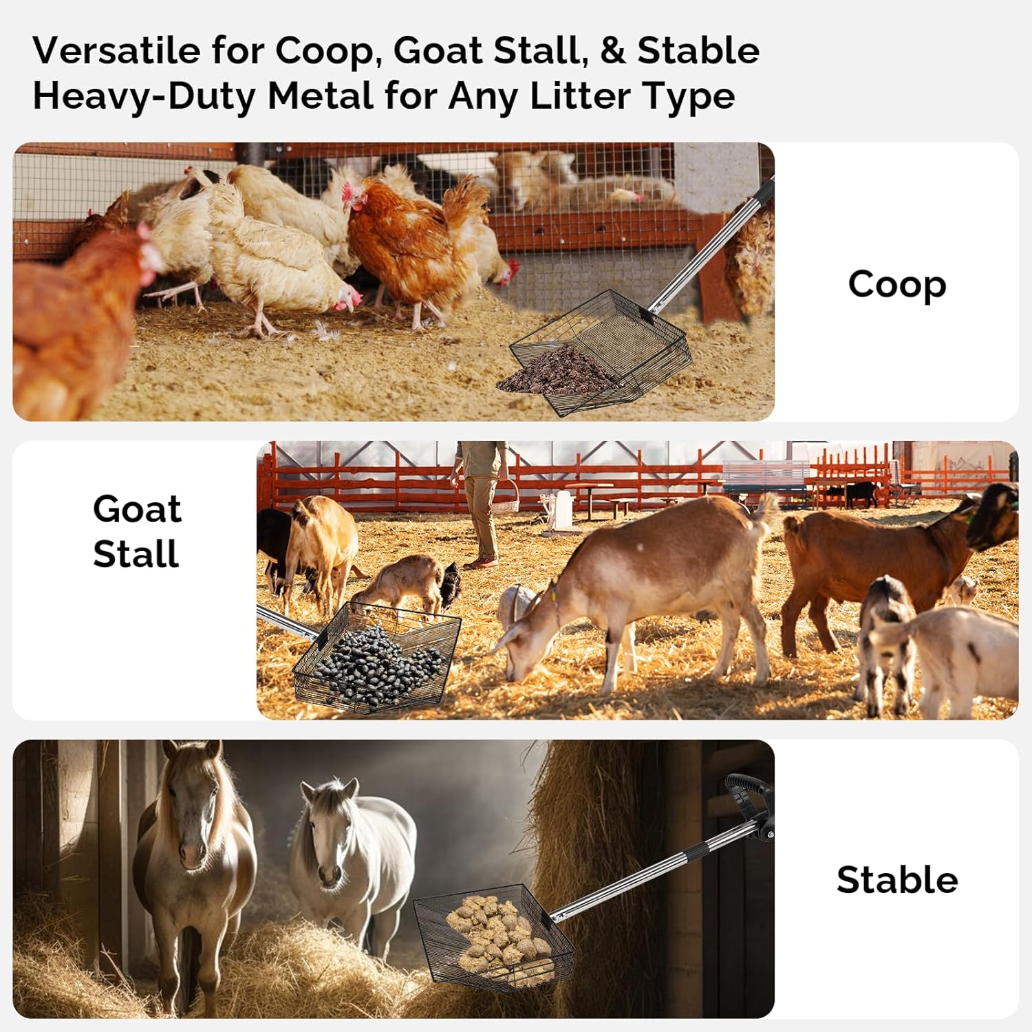 15" Extra-Wide Chicken Poop Scooper โ Ergonomic Adjustable Handle (24-70in), Stainless Steel Sifting Shovel Deep Litter Cleaning for Chicken Coops, Goat - Chicken Coop Scoop for Sand, Straw, Hemp