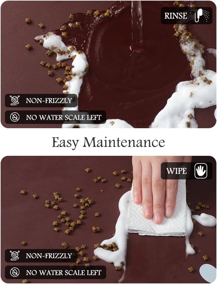 - Keep Clean & No Stains:No marks will be left when food and water are dropped on the dog food mat. Unlike traditional silicone pet feeding mats, our pet feeding mat for food and water won't pick up pet hair or dust, and won't build up tough-to-clean limescale, keeping the dog bowl mat as good as new forever.