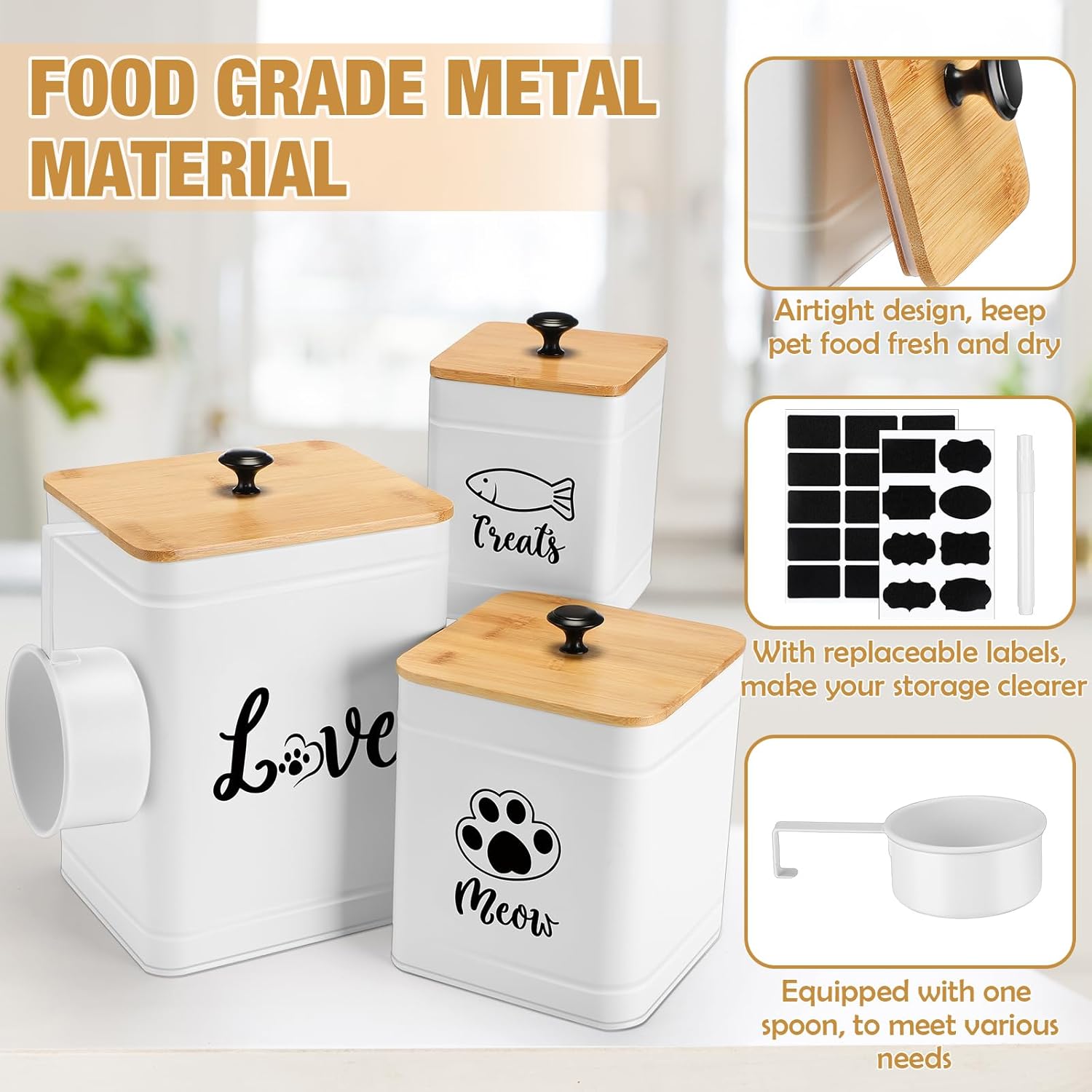 Metal Airtight Cat Food Containers Set of 3 with Bamboo Lids and Spoon 7+3+2 Lbs Cat Treat Storage Container Countertop with DIY Labels Pet Cookie Organizer Jars for Kitchen Counter(White)