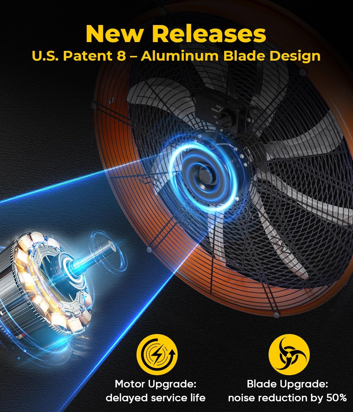 - Upgraded 24โ High Velocity Industrial Drum Fan: Quieter 3-speed electric motor and 8 unique aluminum blades allow airflow up to 9,500 cubic feet per minute. 840/998/1130 rpm. thinner and lighter than other 24โ drum fans, but with more airflow and better noise control. Recommended for use in warehouses, factories, garages, workshops and other large locations.