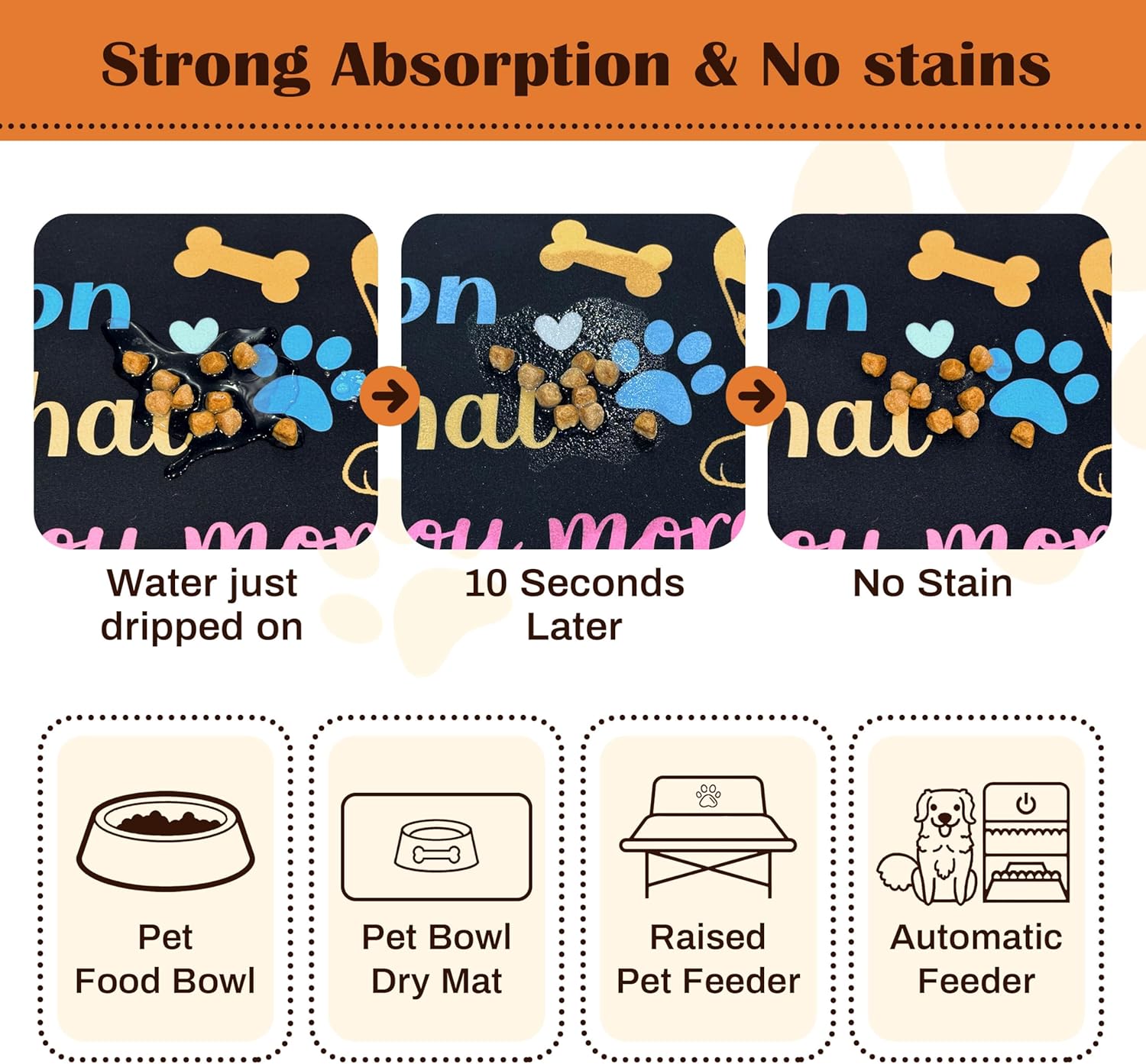 - Waterproof & Easy Clean Dog Food Mats for Floors Waterproof - Unlike regular mats, our heavy-duty dog food mat features a 100% waterproof layer that prevents liquids from seeping through the floor. Simply wipe clean your dog bowl mat after meals - no staining or odors! Works great as both a dog food mat and cat food mat.