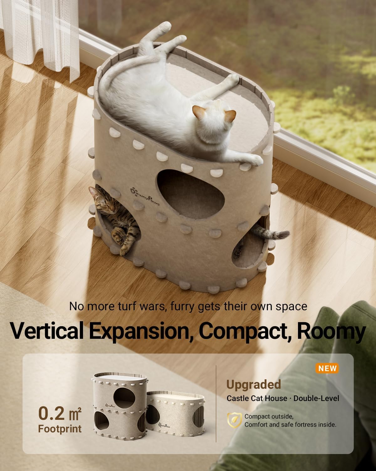 DownyPaws Cat House for Indoor Cats, 2-Storey Foldable Cat Bed Cave, Felt Cats Tunnel Bed Condo, Castle Kitten Cube Hideaway for Multicats, Scratch Resistant, Cream