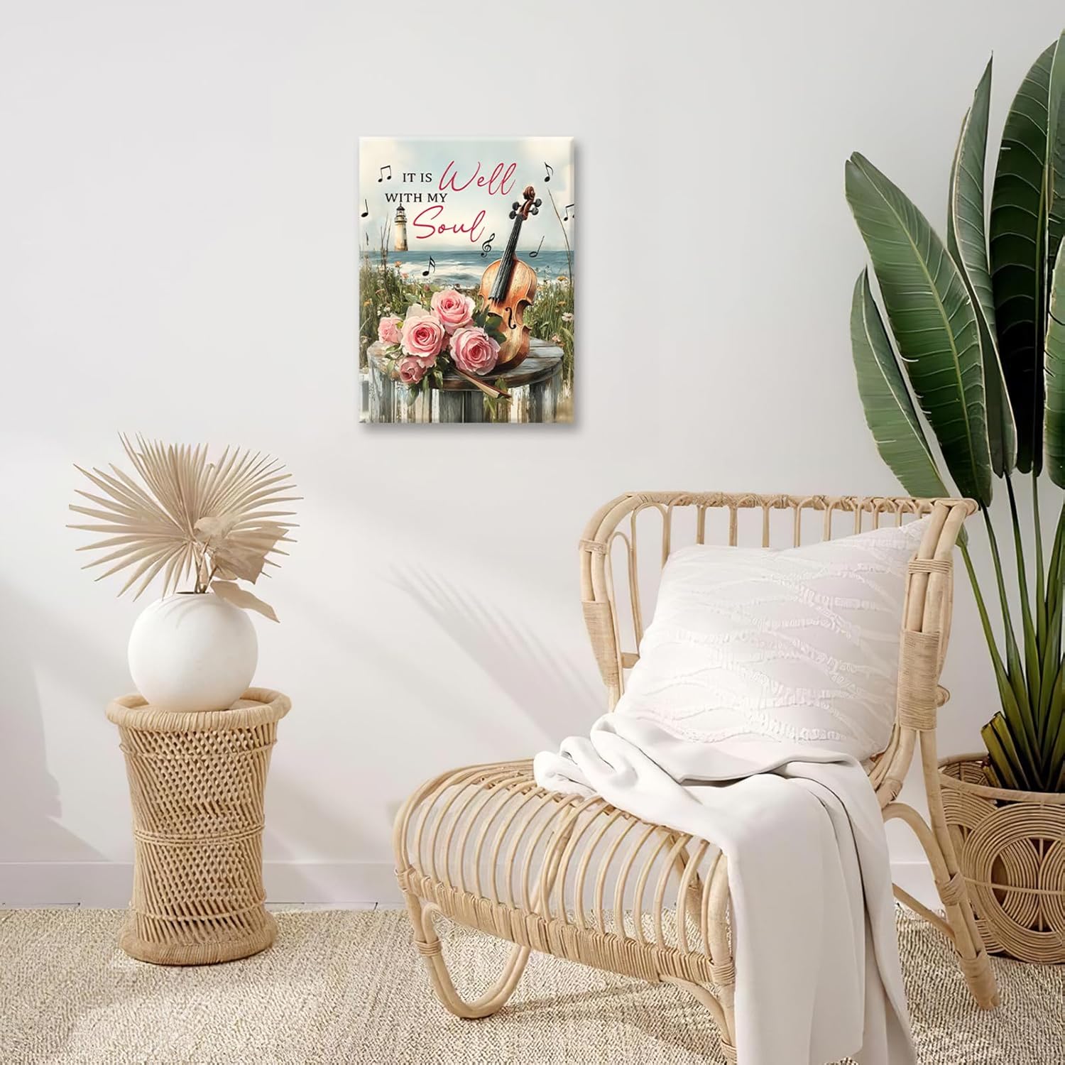 Violin Pictures Wall Art, Music Rustic Inspirational Bathroom Wall Decor, Coastal lighthouse Framed Painting Rose Aesthetics Canvas Artwork for Bathroom Bedroom Living Room Decorations 16"L x 12"W