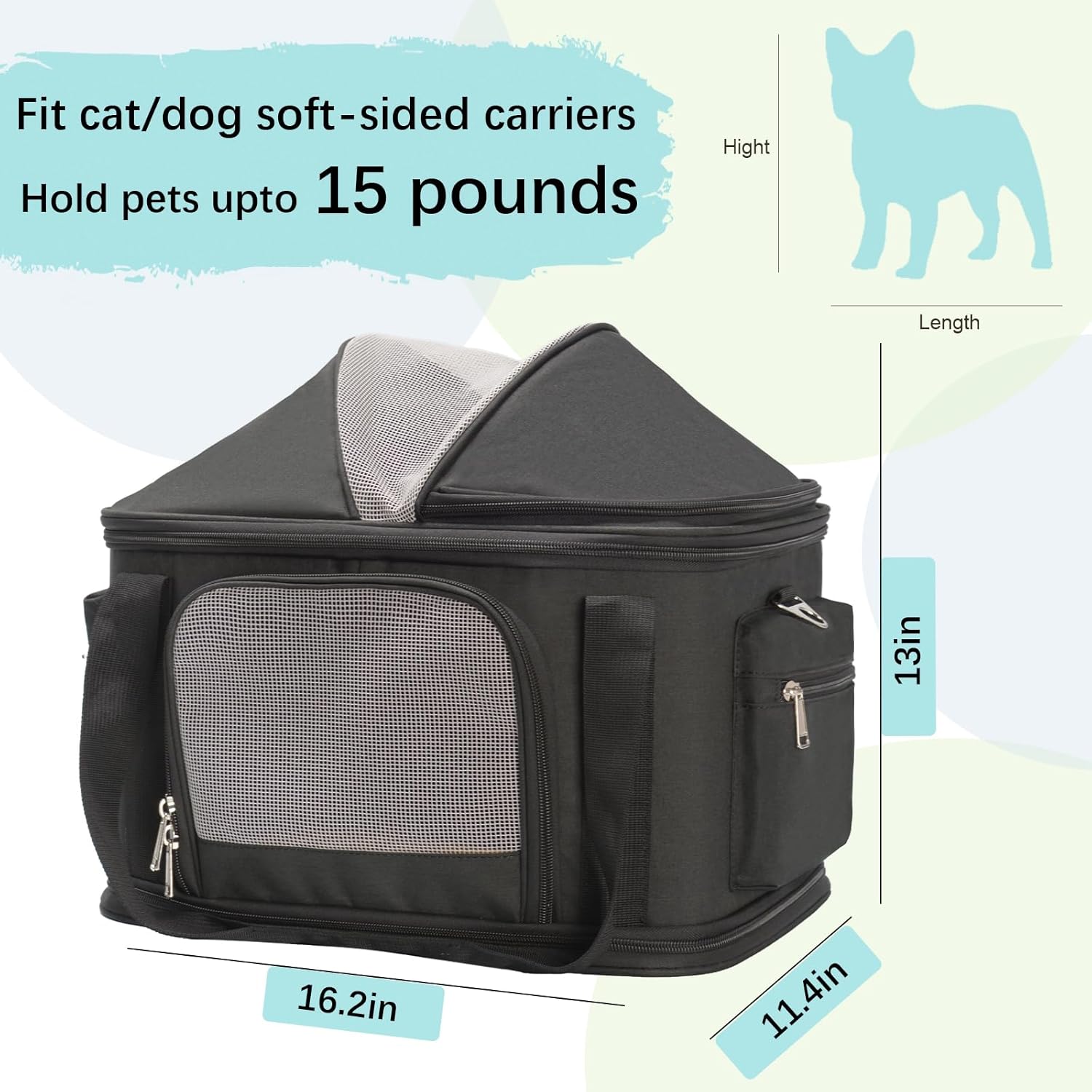 - Spacious Pet Bag Carrier:Designed with a roomy interior to give your pet plenty of space to sit, lie down comfortably. Carrier Dimensions(LxWxH): 15inch x 7.5inch x 12.2inch. Interior Dimensions(LxWxH): 14.2inch x 7.5inch x 10.6inch. We recommend this pet carrier for pets under 10 lbs. Please check the dimensions carefully before purchasing to ensure it fits your dog/cat/rabbit/other pets