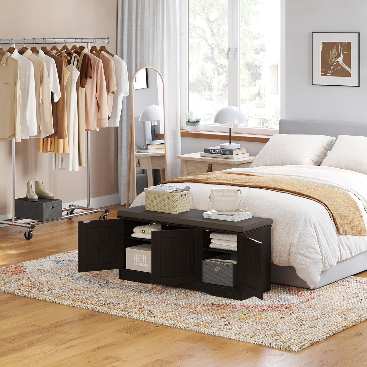 - 【Effortless Push-to-open Door】Feature a fully enclosed design with a press-to-open mechanism, keeping shoes clean and tidy while avoiding accidental bumps against door handles during use. Reasonable height and soft cushion let you change shoes by sitting on the bench more comfortable without bending down or squatting