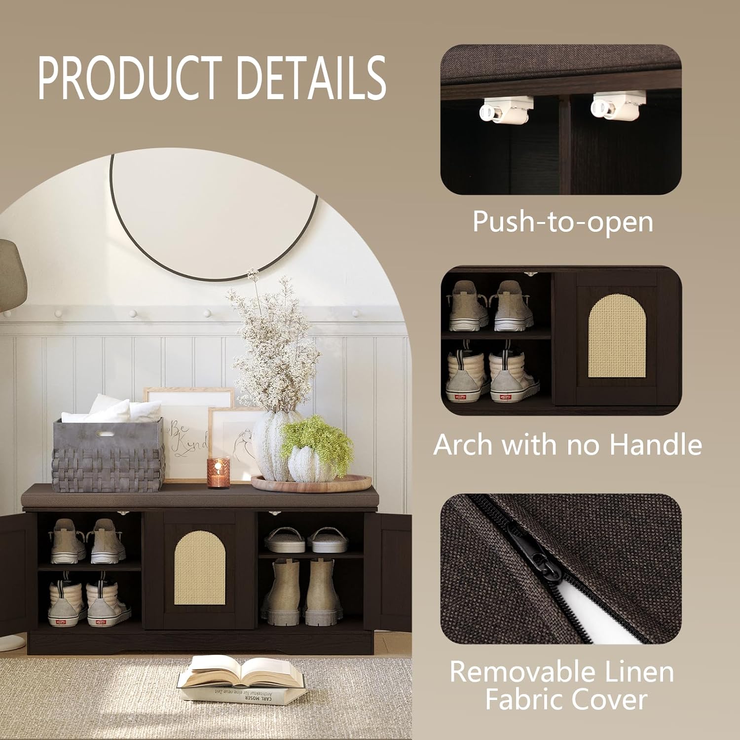 - 【Effortless Push-to-open Door】Feature a fully enclosed design with a press-to-open mechanism, keeping shoes clean and tidy while avoiding accidental bumps against door handles during use. Reasonable height and soft cushion let you change shoes by sitting on the bench more comfortable without bending down or squatting