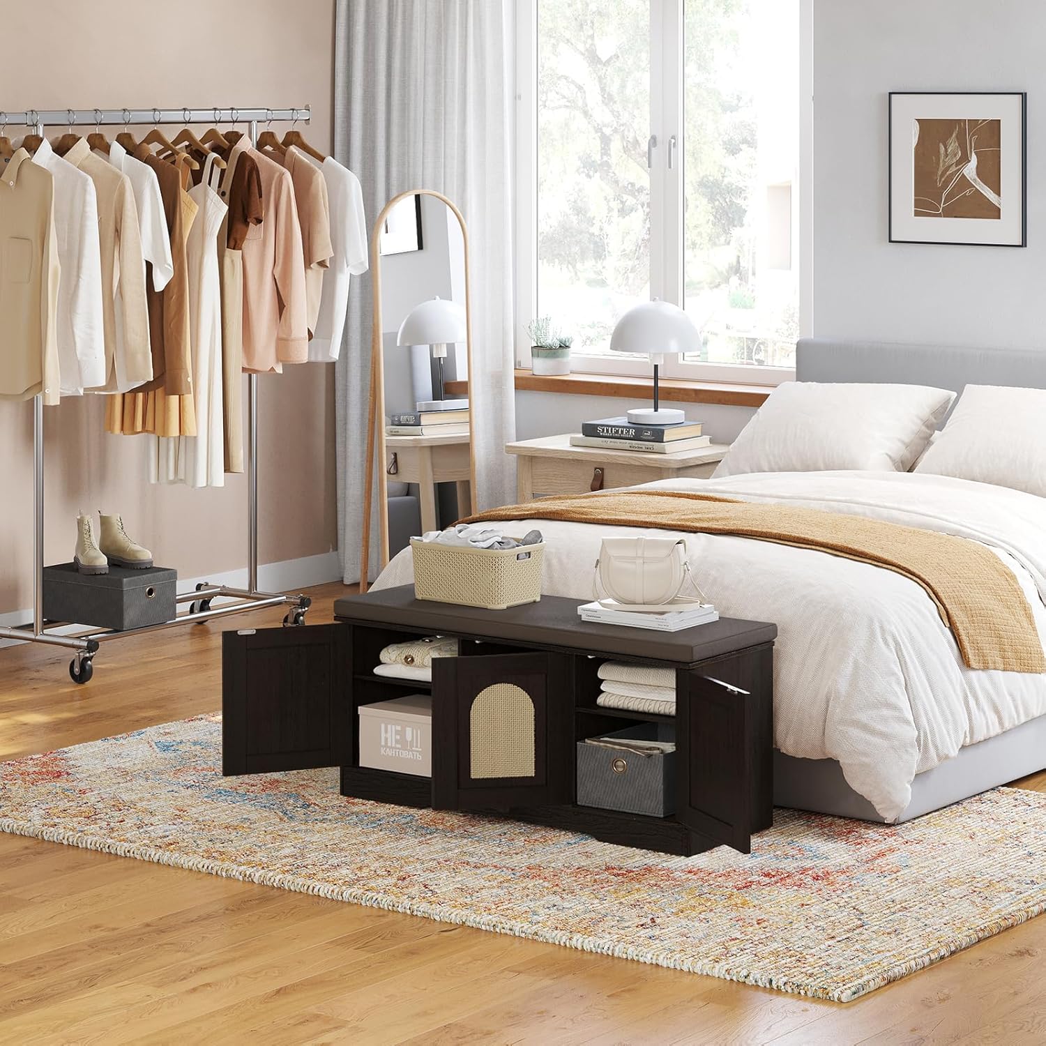 - 【Flexible for Multiple Needs】2 middle compartments are fixed for sneakers, high heels and sandals. The side compartments have 3 adjustable heights for slippers, tall boots or storage boxes. Use as an entryway bench, window seat or bedside bench to store blankets, books and toys in the living room and bedroom