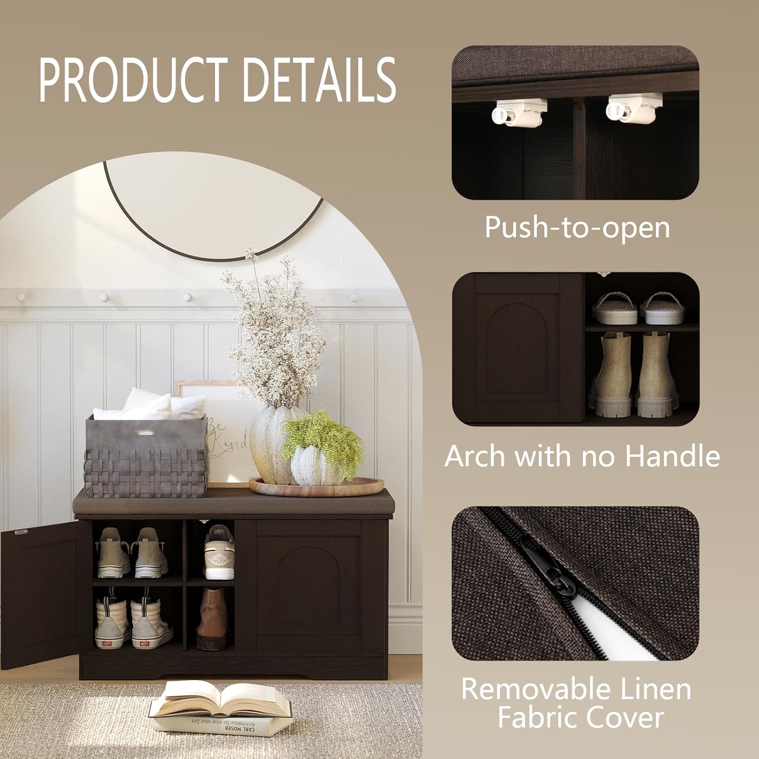 - 【Effortless Push-to-open Door 】Feature a fully enclosed design with a push-to-open mechanism, keeping shoes clean and tidy while avoiding accidental bumps against door handles during use. Reasonable height and soft cushion let you change shoes by sitting on the bench more comfortable without bending down or squatting