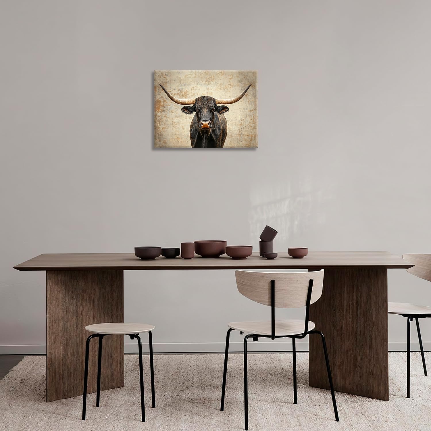 Rustic Highland Cow Pictures Wall Art, Farmhouse Longhorn Bull Bathroom Wall Decor Black Cow Framed Painting Canvas Artwork for Bathroom Bedroom Living Room Decorations 16"L x 12"W