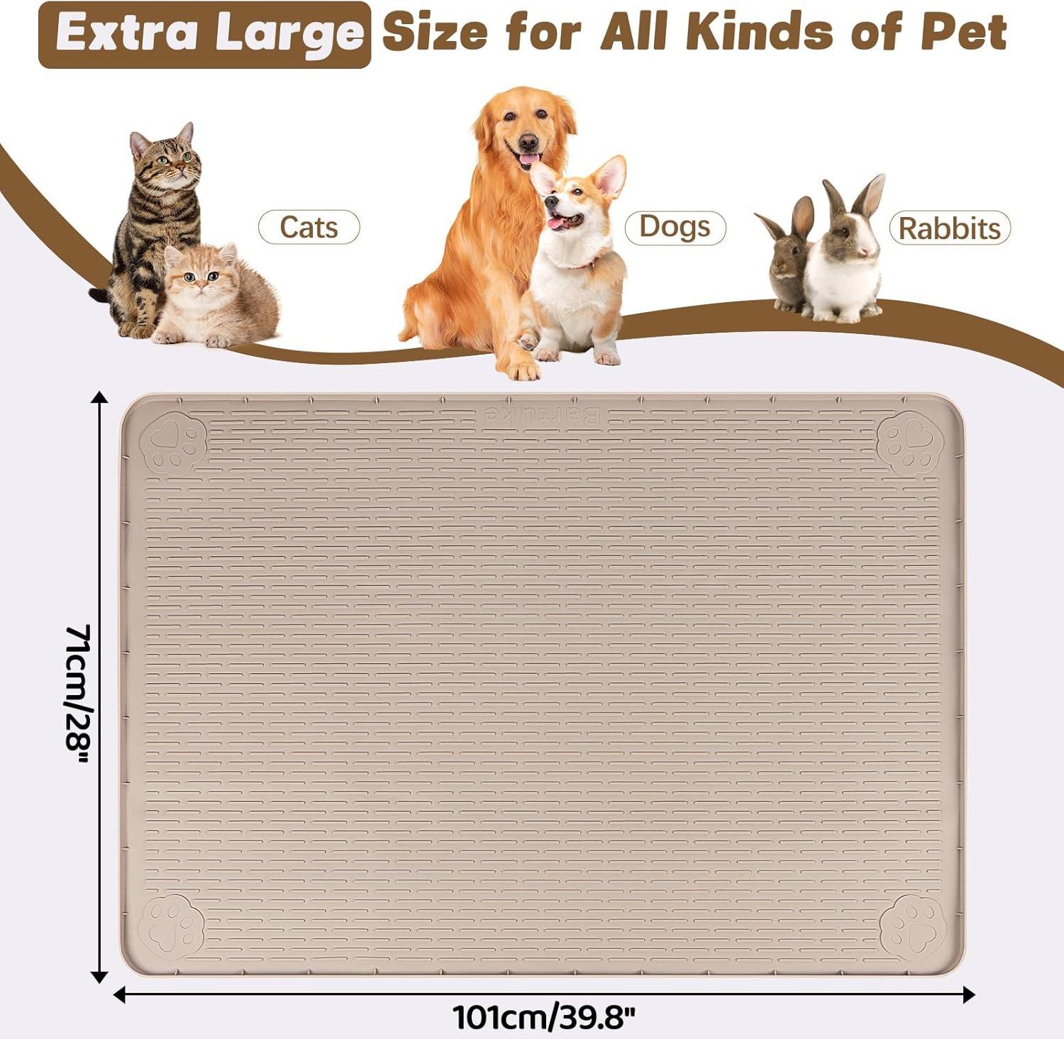 • Large Cat Food Mat: This large 40"x28" (101 x 71cm) cat food mat has enough space for multiple bowls, and perfect for dogs, cats and other pets to eat together, keep paws and floors clean