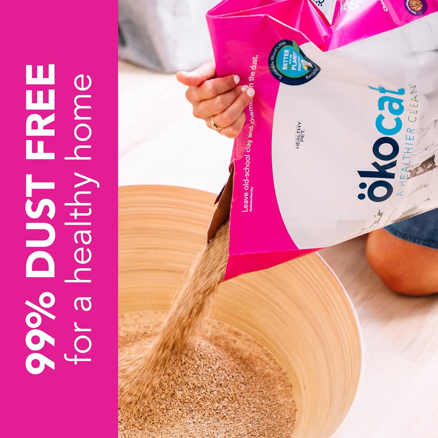 - 99% DUST FREE FOR A HEALTHIER HOME: Clean wood fiber is screened & de-dusted for a cleaner pour. okocat natural cat litter has NO dirty clay dust. NO artificial fragrance, synthetic chemicals, or toxic dyes, and NO Zeolite. Biodegradable & compostable.