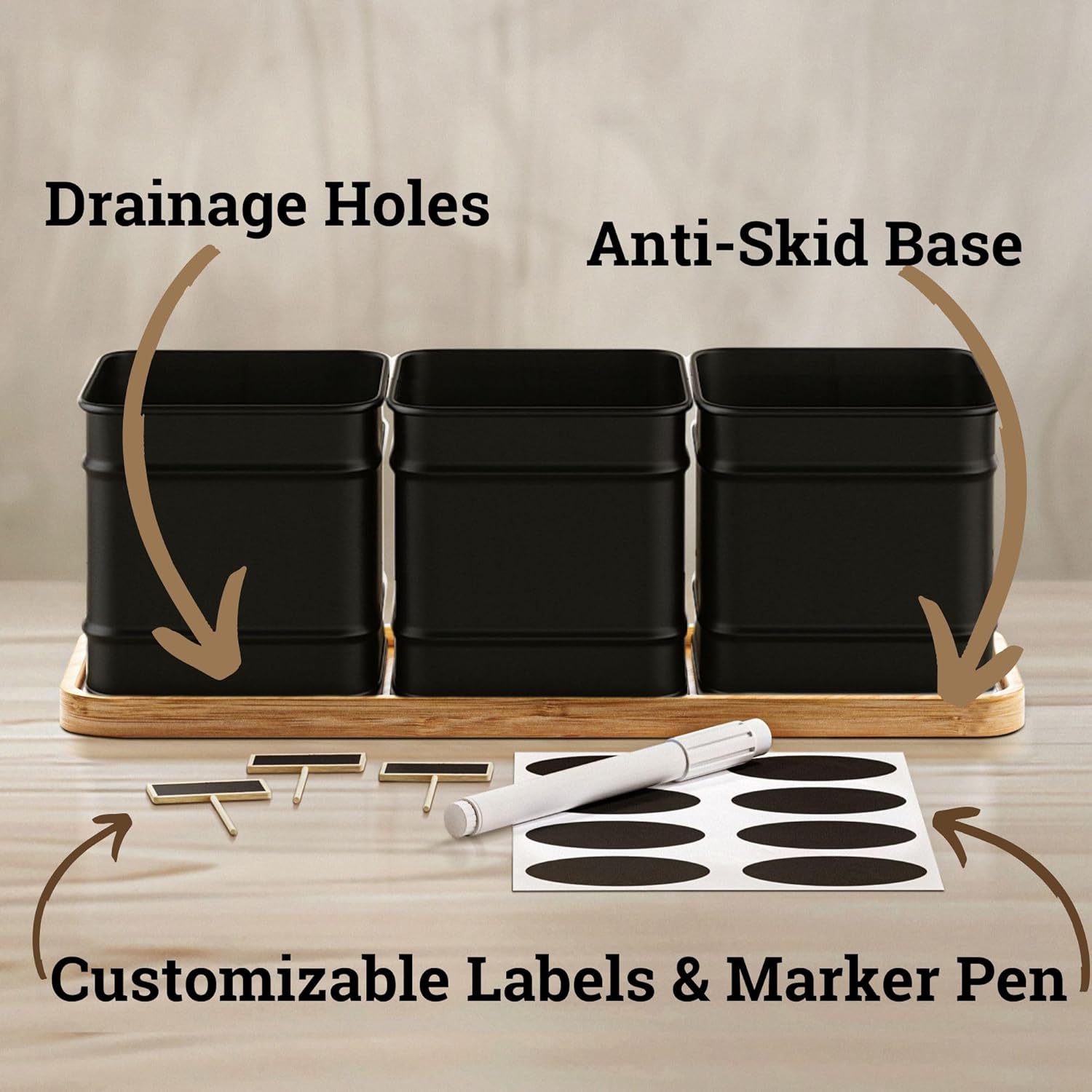 Herb Planter Indoor - 3 Iron Herb Pots with Drainage Holes, Varnished Bamboo Tray, Customizable Labels & Marker Pen - Indoor Herb Garden Planter - 3 Pots for Herbs - Inside Spice Garden - Basil Pot