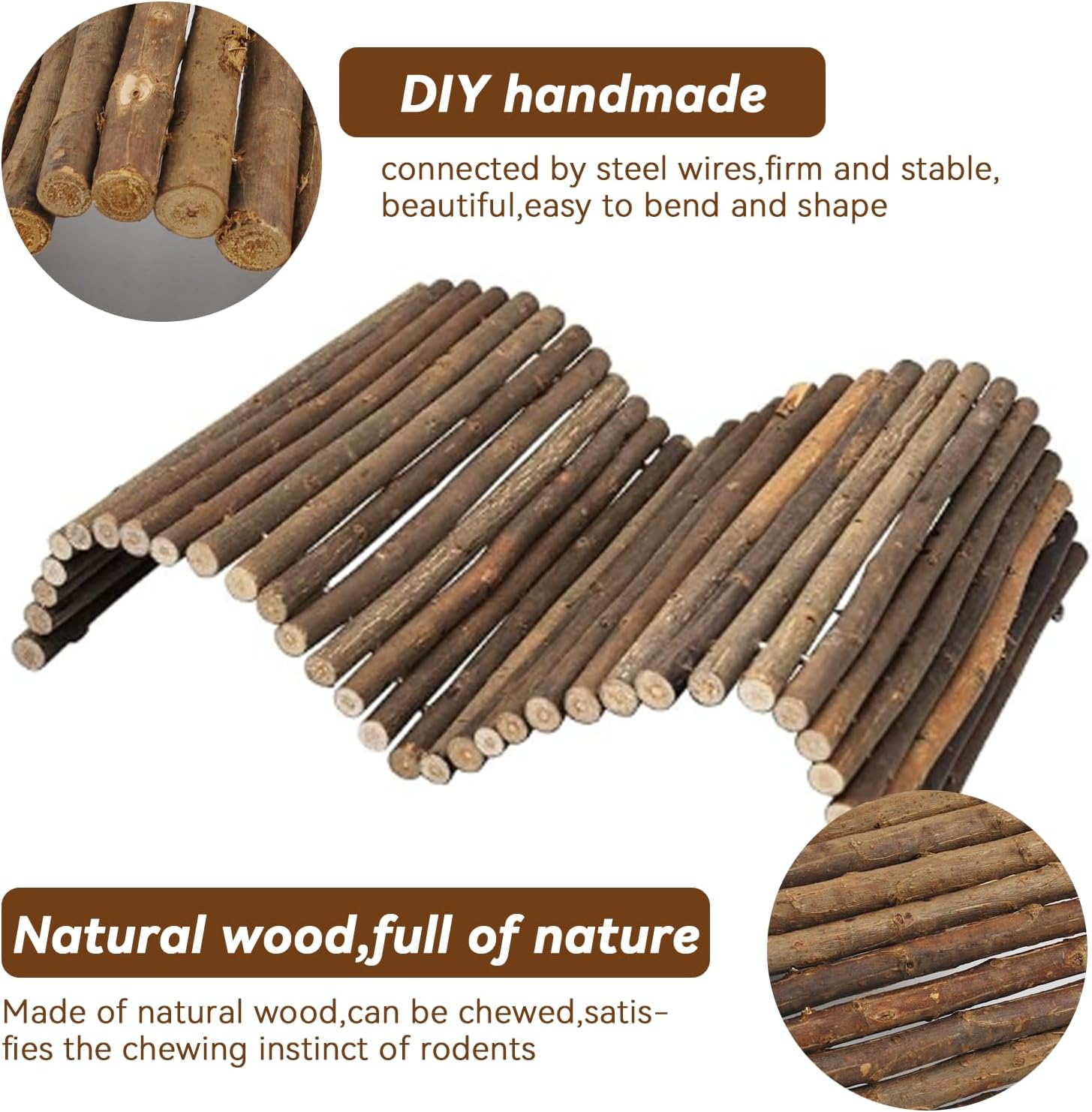 - 【Product Features】Wood guinea pig ladder internal metal wire can be freely bent,pliable and flexible,bunny wooden tunnels can be designed into tunnels,bridges or slopes and other shapes,adding more fun for pets. And flexible wood hideout made of solid wood is very sturdy, durable and practical.