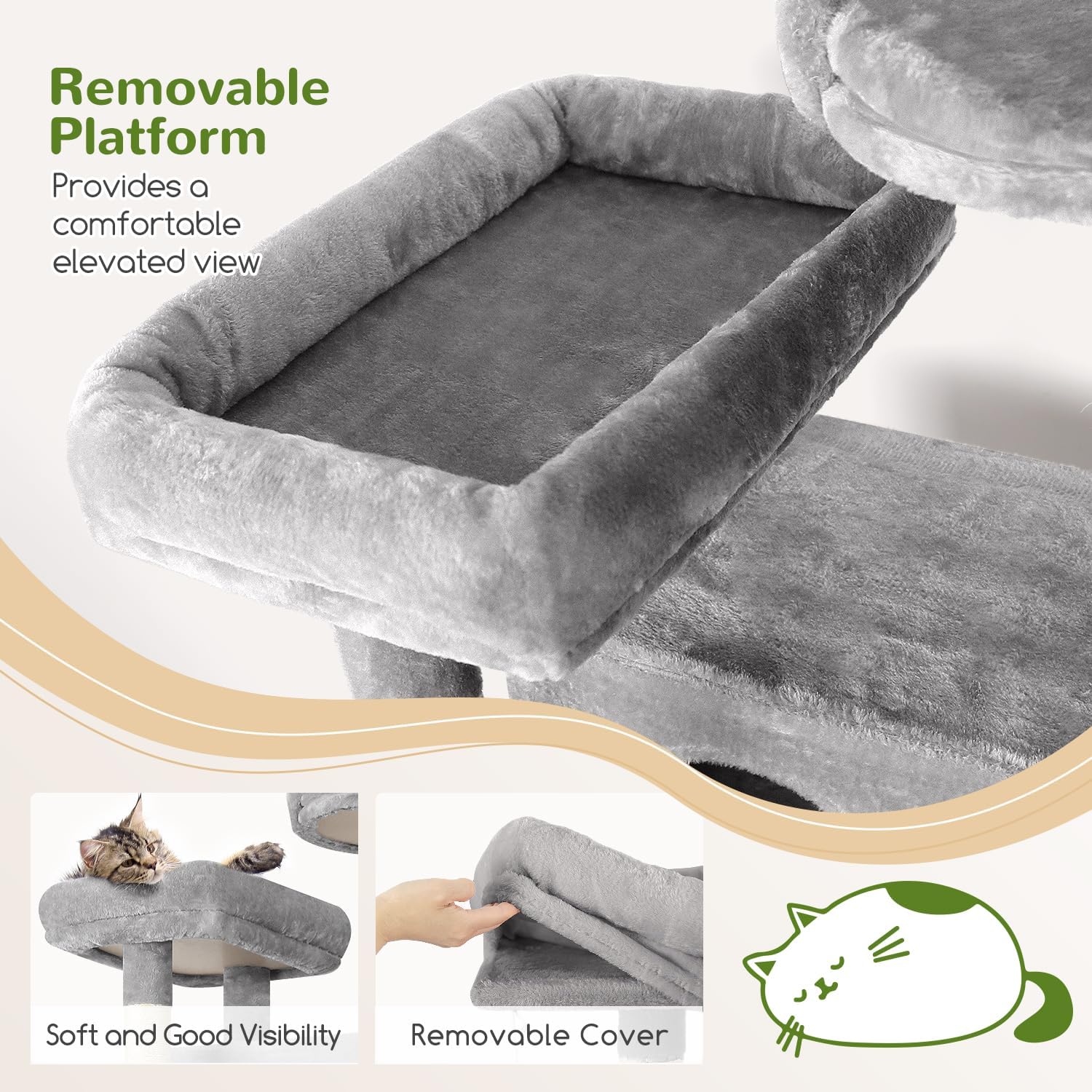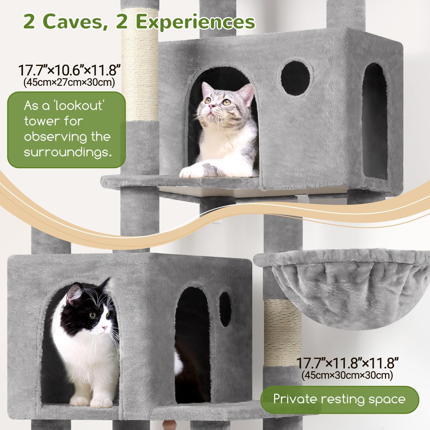 - MULTIPLE RESTING PLACES: Our tall cat tree features a enlarge platform (11.8β x 17.7β), a high point top perch and two spacious cozy cat caves, making it an excellent choice for multi-cat households. Provide ample space and multiple activity areas, allowing each cat to find its own cozy corner and enjoy the fun of playing together