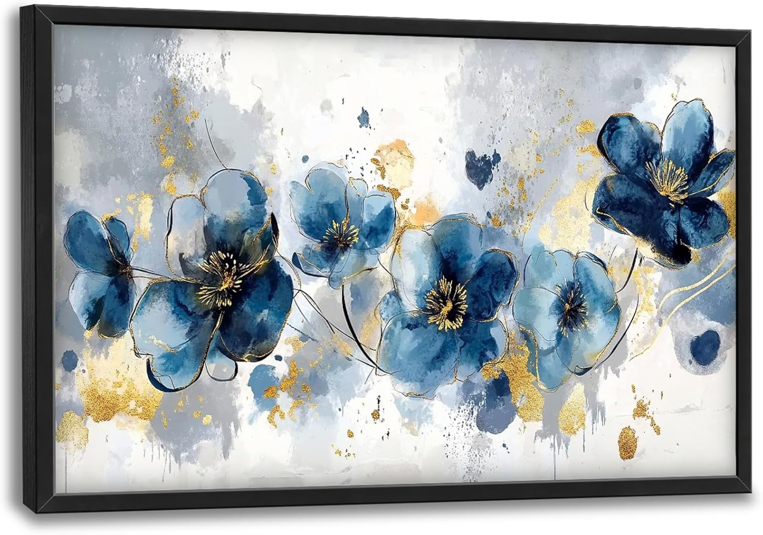 Extra Large Framed Abstract Blue Flower Wall Art,Oversized Golden Grey Floral Wall Decor Pictures for Living Room,Canvas Print Painting Modern Artwork Bedroom Office Bathroom Home Decor 36L" x 24W"