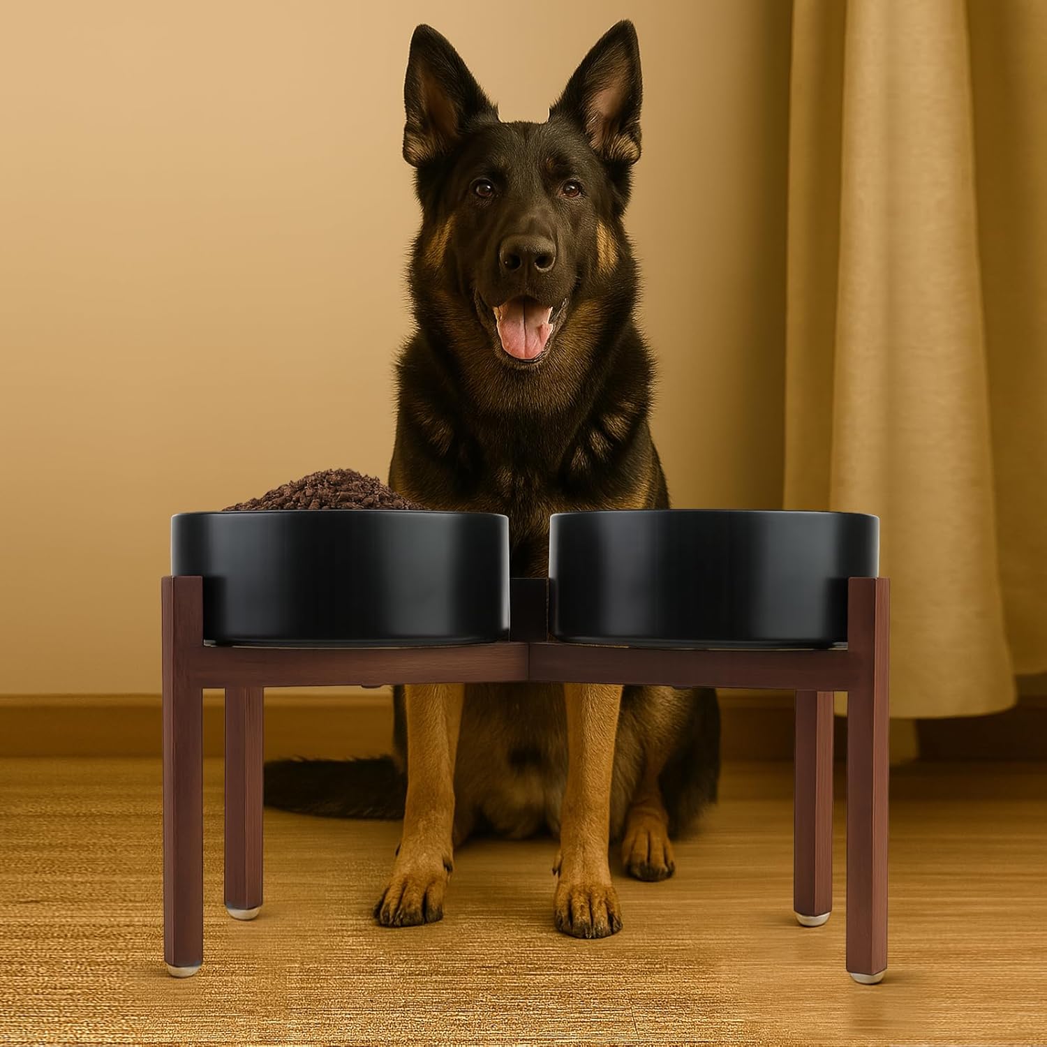 SPUNKYJUNKY Raised Ceramic Dog Bowls Set with Non-Slip Acacia Wood Stand for Large Sized Dog(60.87 OZ, Black)