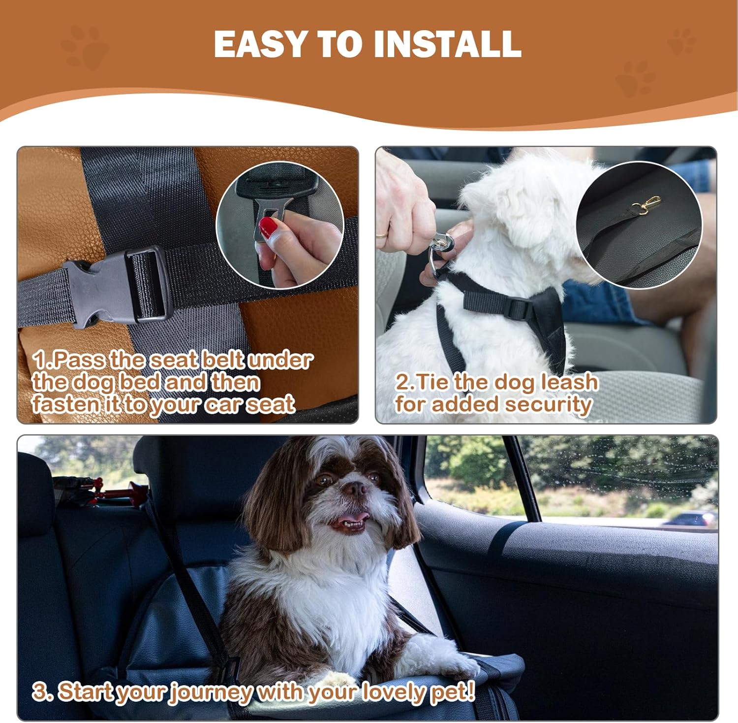 • [Premium Leather Dog Car Seat]: This dog car seat is made from high-quality leather, which is wear-resistant and scratch-resistant, and very durable. The interior is filled with pp foam to enhance cushioning. The adjustable lock on the back and the reserved seat belt position can firmly fix this pet car booster seat to the car seat, improving the safety of the dog during car driving.
