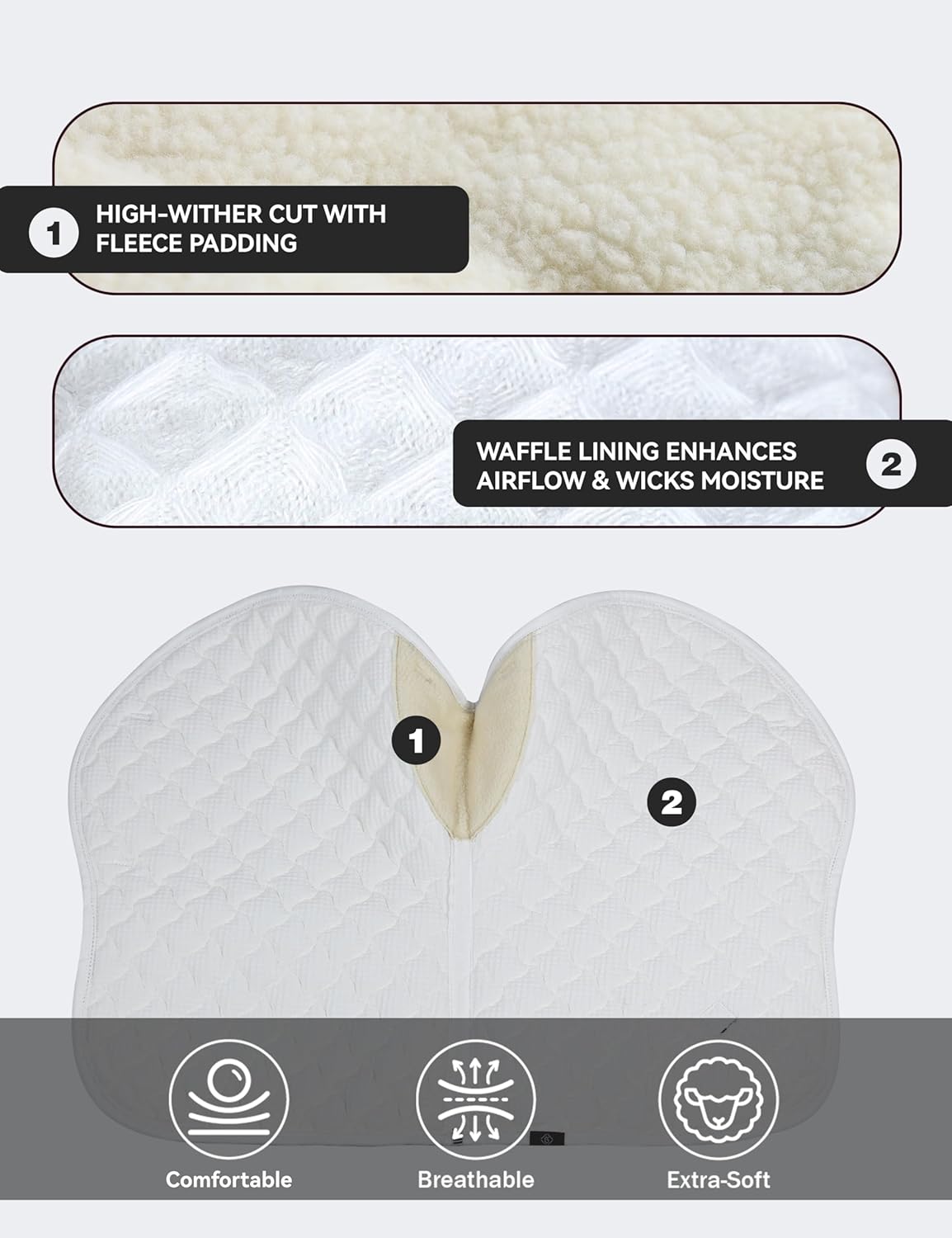 - High-Efficiency Moisture Wicking: Inner layer made of 65% polyester + 35% cotton blend, quickly wicks away sweat to keep the horse's back dry; soft waffle design ensures a snug, anti-slip fit without irritating the horse.