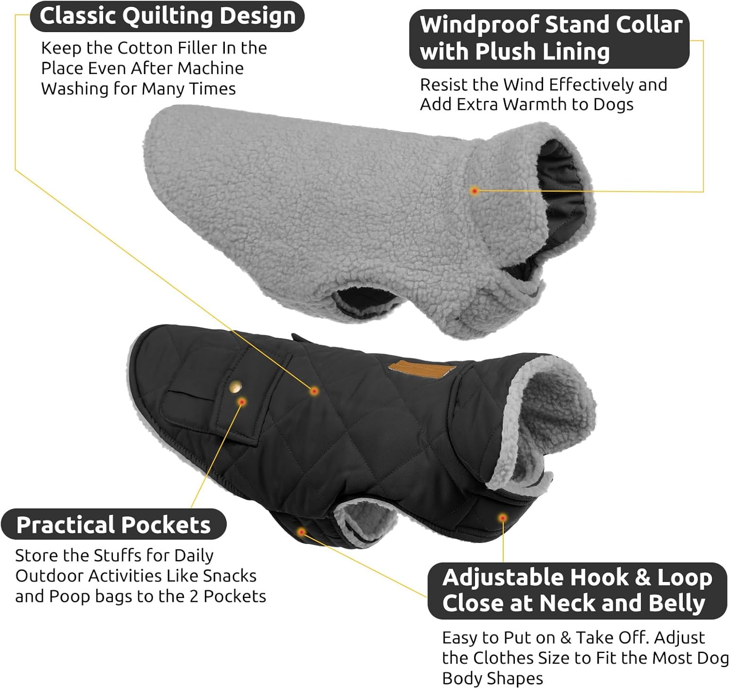 - ULTRA WARM COLD WEATHER DOG JACKET - The thick and warm winter dog coat is made of soft windproof polyester with polycotton quilting workmanship and the lining is made of heavy short plush polyester sherpa. The warm jacket can company your dog come through this cold winter.