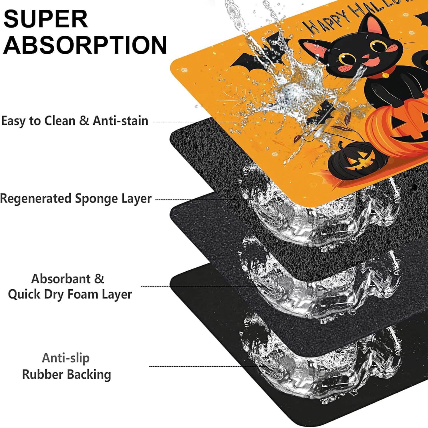 Happy Halloween Cat Pet Feeding Mat for Floors-Absorbent Dog Bowl Mat for Food and Water, Quick Dry Pet Cat Feeding Mats with Non Slip Bottom, Mess-Free Dog Accessories 12"x20"