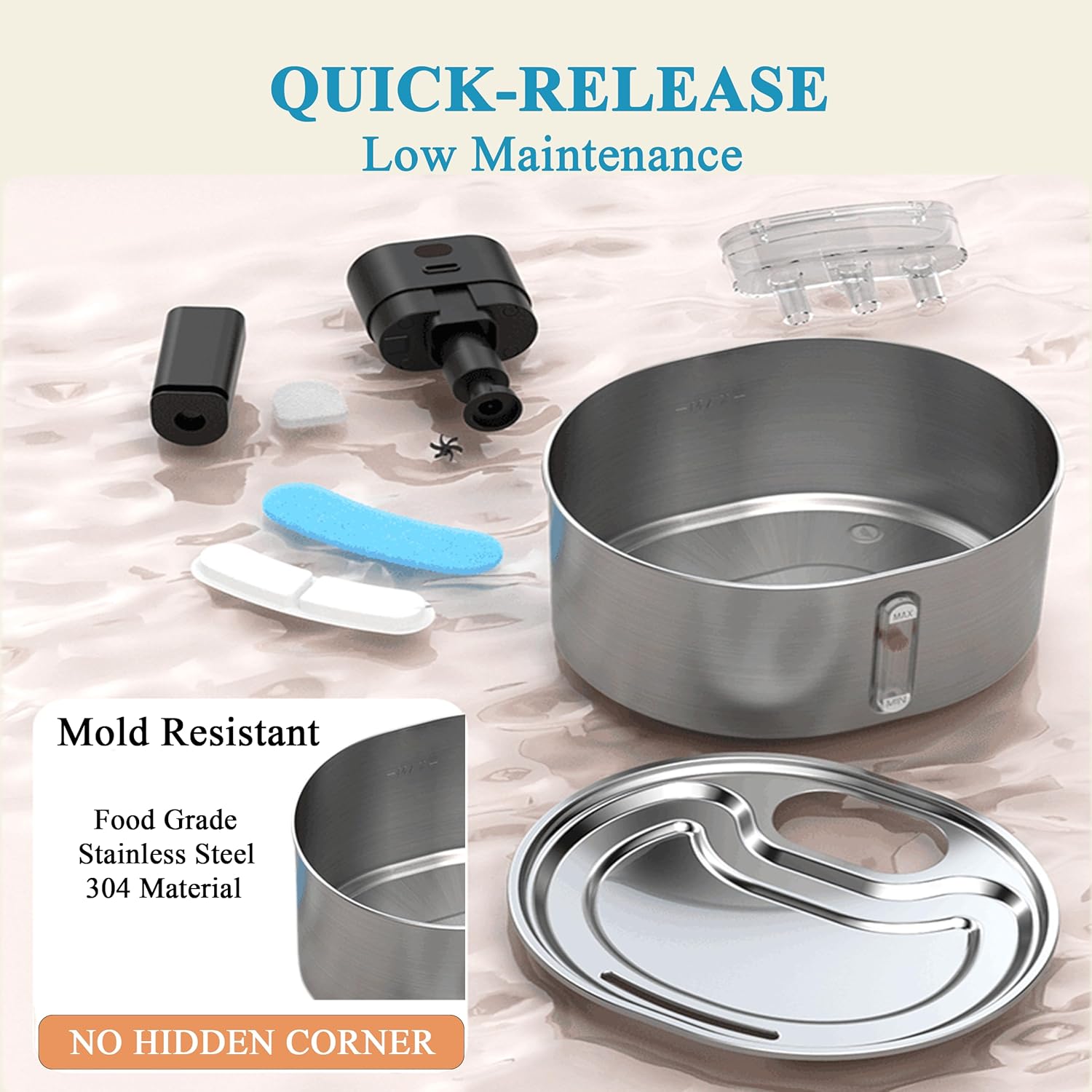 - Premium 304 Stainless Steel Construction—rust-proof, dishwasher-safe, and free from material leaching. As a leading stainless steel water fountain for cats, it outperforms plastic models in hygiene. Dimensions: 9.3"L×8.2"W×6.3"H