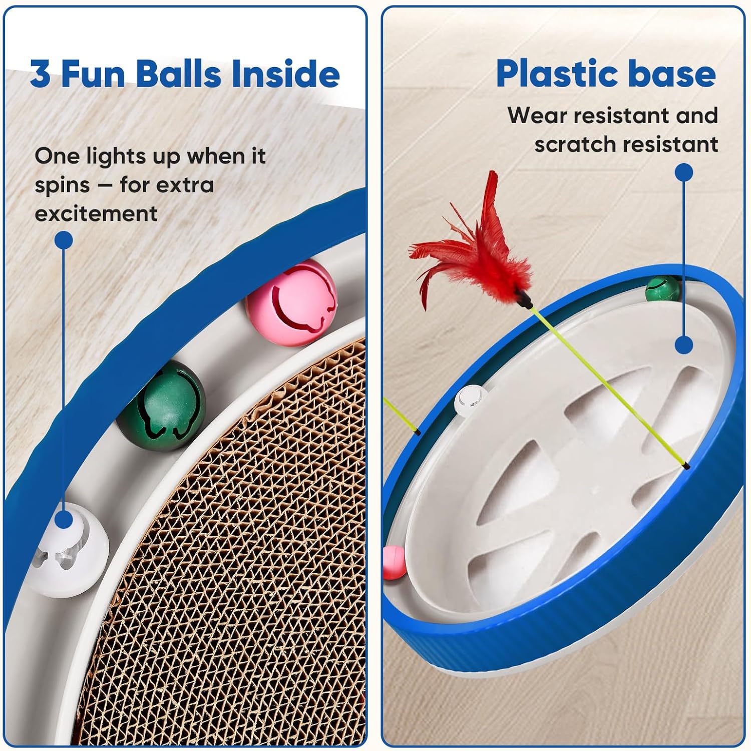 20-Inch Round Cat Scratcher with Ball Track – 3-in-1 Cardboard Scratching Pad with Feather Toy & Non-Slip Base – Interactive Cat Toy for Indoor Cats, Kittens & Large Cats (Blue)