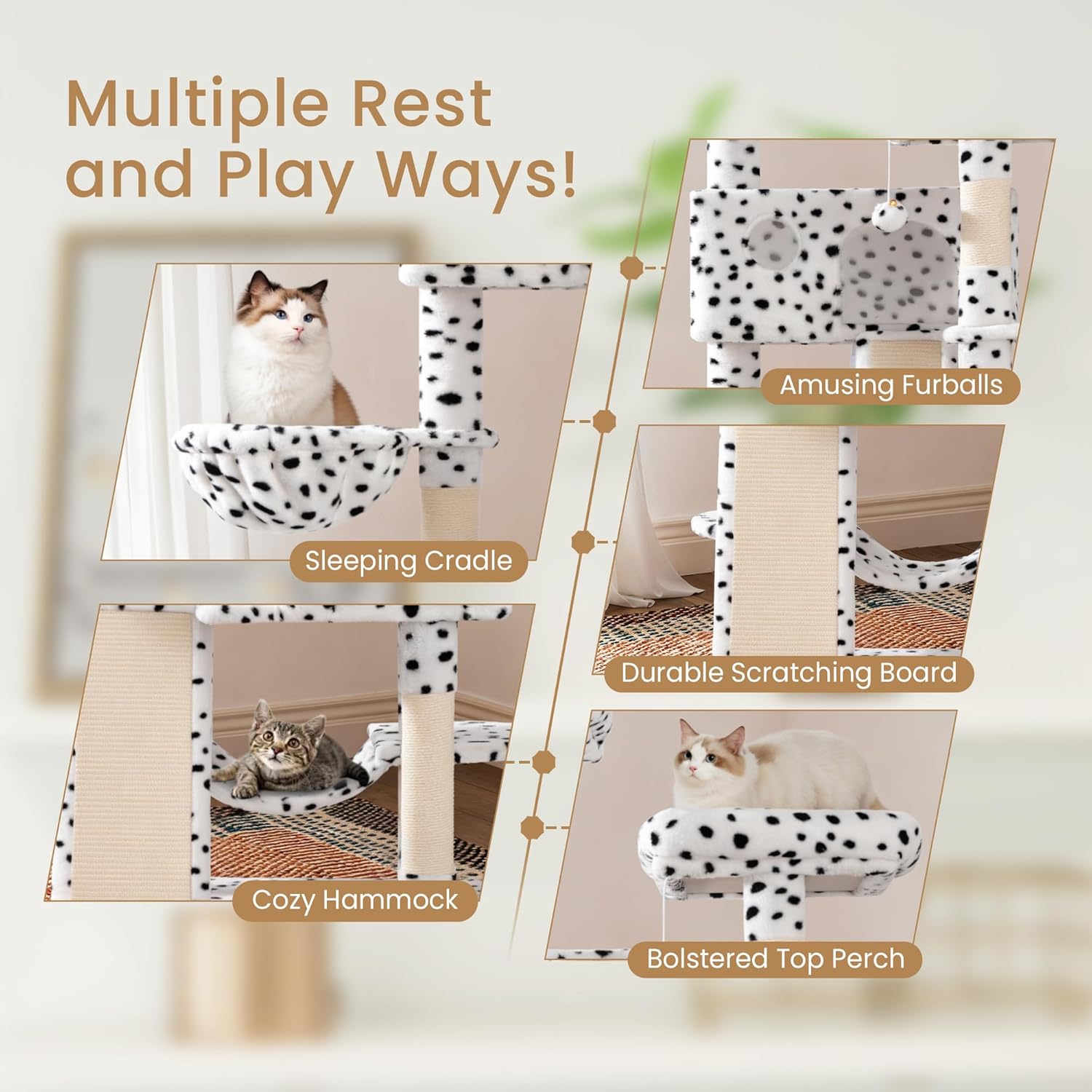 SHA CERLIN 65in Larger Cat Tree Tower Condo for Indoor Kitties/Multi-Level Furniture Activity Center with Wide Base/Cozy Plush Perches/Baskets/Sisal Scratching Posts and Hammock/White & Black Spot