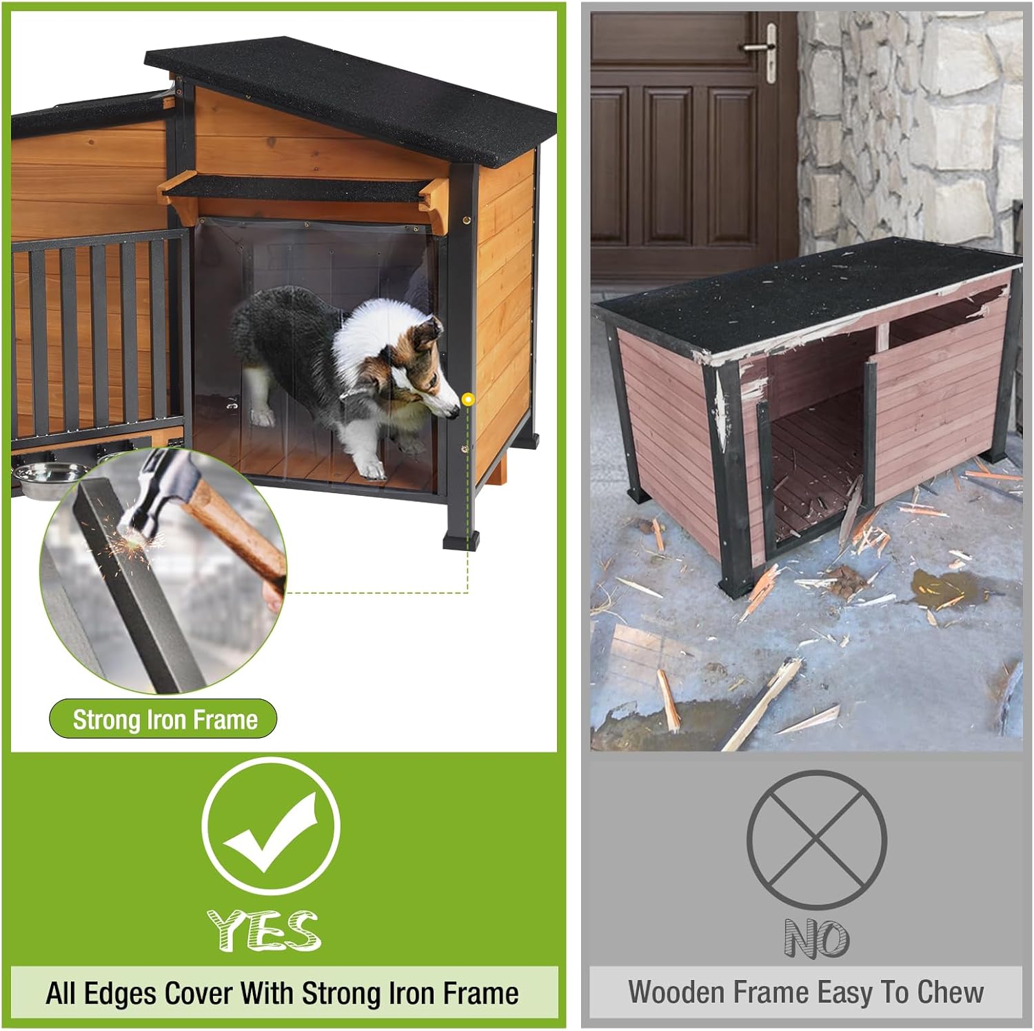 - All-Weather Protection: Asphalt roof shields against rain and sun, PVC door curtain blocks wind and cold, and raised waterproof feet keep the dog kennel dry and elevated