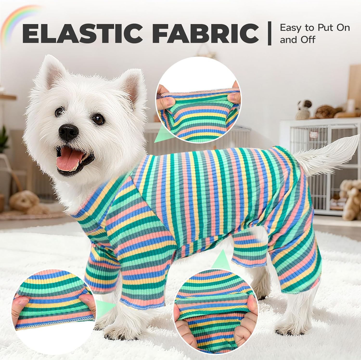 - SUPER-STRETCHY & EASY PUT ON/OFF:These dog pajamas feature exceptional stretchability throughout the entire garment, including the neckline, cuffs, leg openings, and waist area. The stretchy neckline expands comfortably for easy head placement, while the flexible cuffs and leg openings allow paws to slide through smoothly. The elastic waist ensures a secure yet comfortable fit that moves naturally with your dog’s body. This thoughtful stretch design makes dressing stress-free and quick, turning what can often be a struggle into a seamless experience for both you and your pet