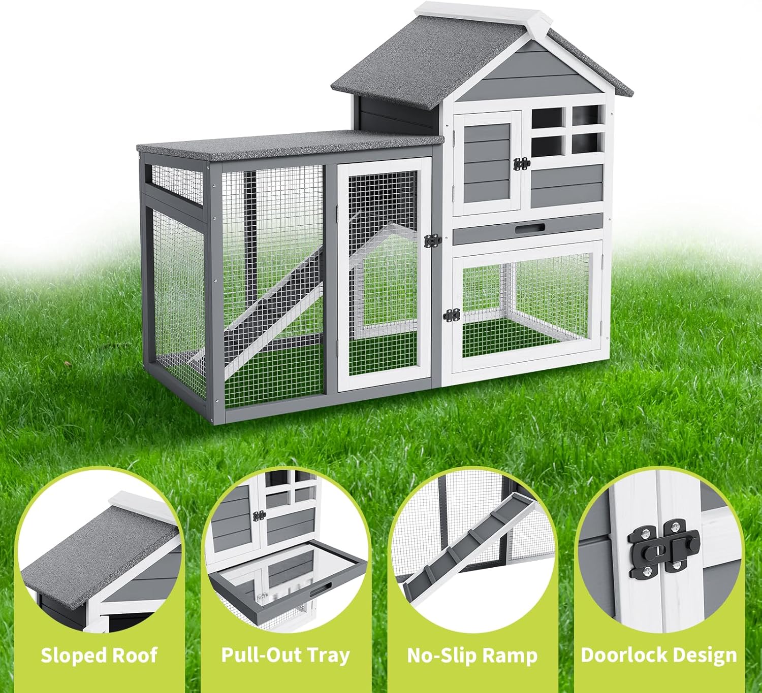- 1. Spacious 2-Tier Rabbit & Chicken Cage: This dual-level rabbit hutch provides separated living zones: a sunny ground run for exercise and a waterproof elevated sleeping area. The tiered design offers ample space for rabbits, guinea pigs, or chickens to play and rest, while the viewing window allows easy monitoring of your pets.