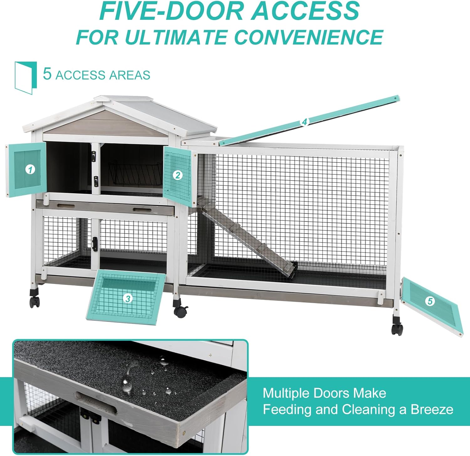 - 【Multiple Doors & Secure Ramp Access】Five front and side doors provide easy entry for feeding and interaction. The textured ramp allows pets to move between levels safely and comfortably
