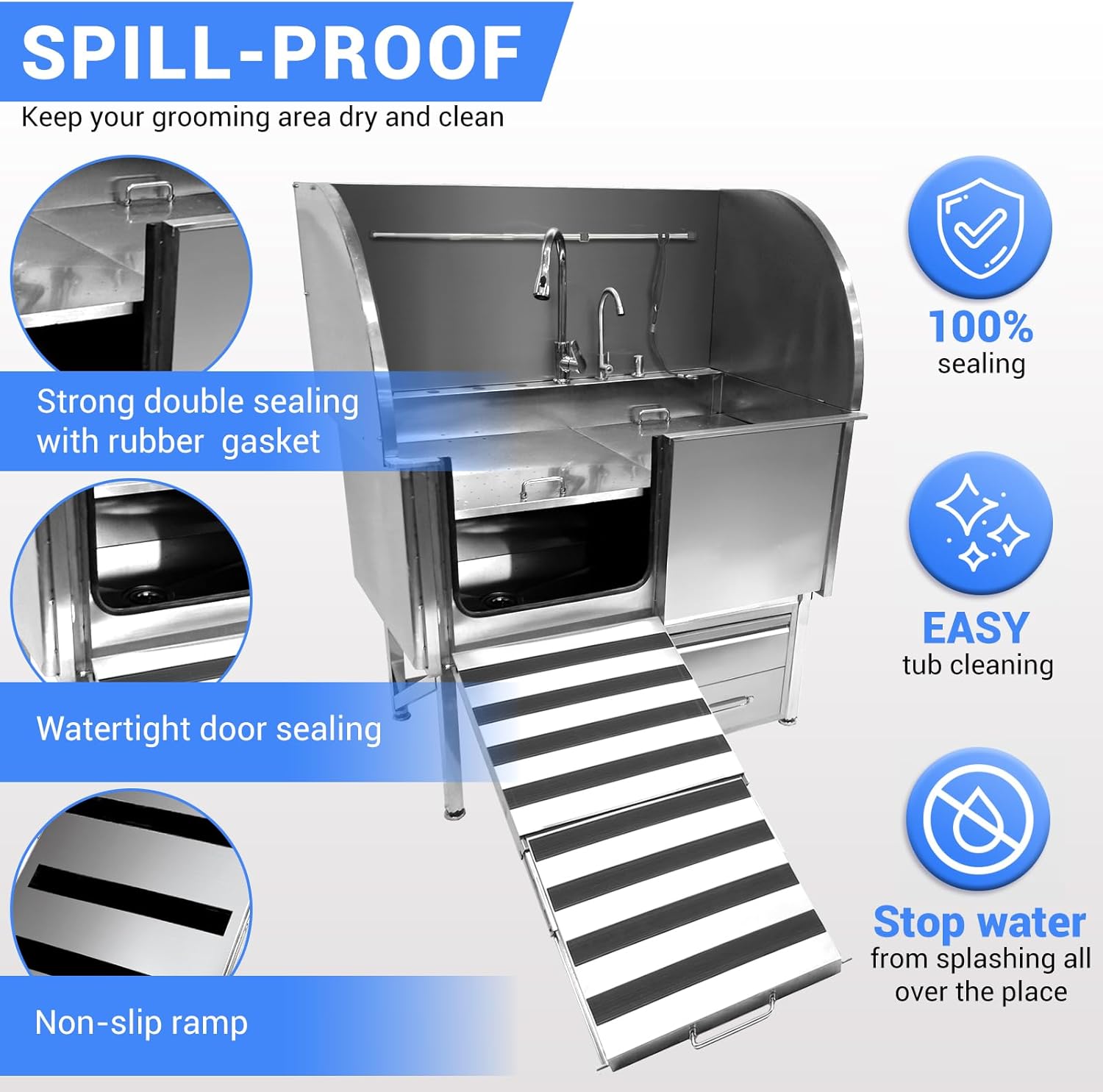 - Spacious Tub with Smart Storage: 50โx30.7โx58.7โ size fits all dog breeds. Includes a large sliding drawer to organize towels, shampoos, and grooming tools for a clutter-free bathing area.