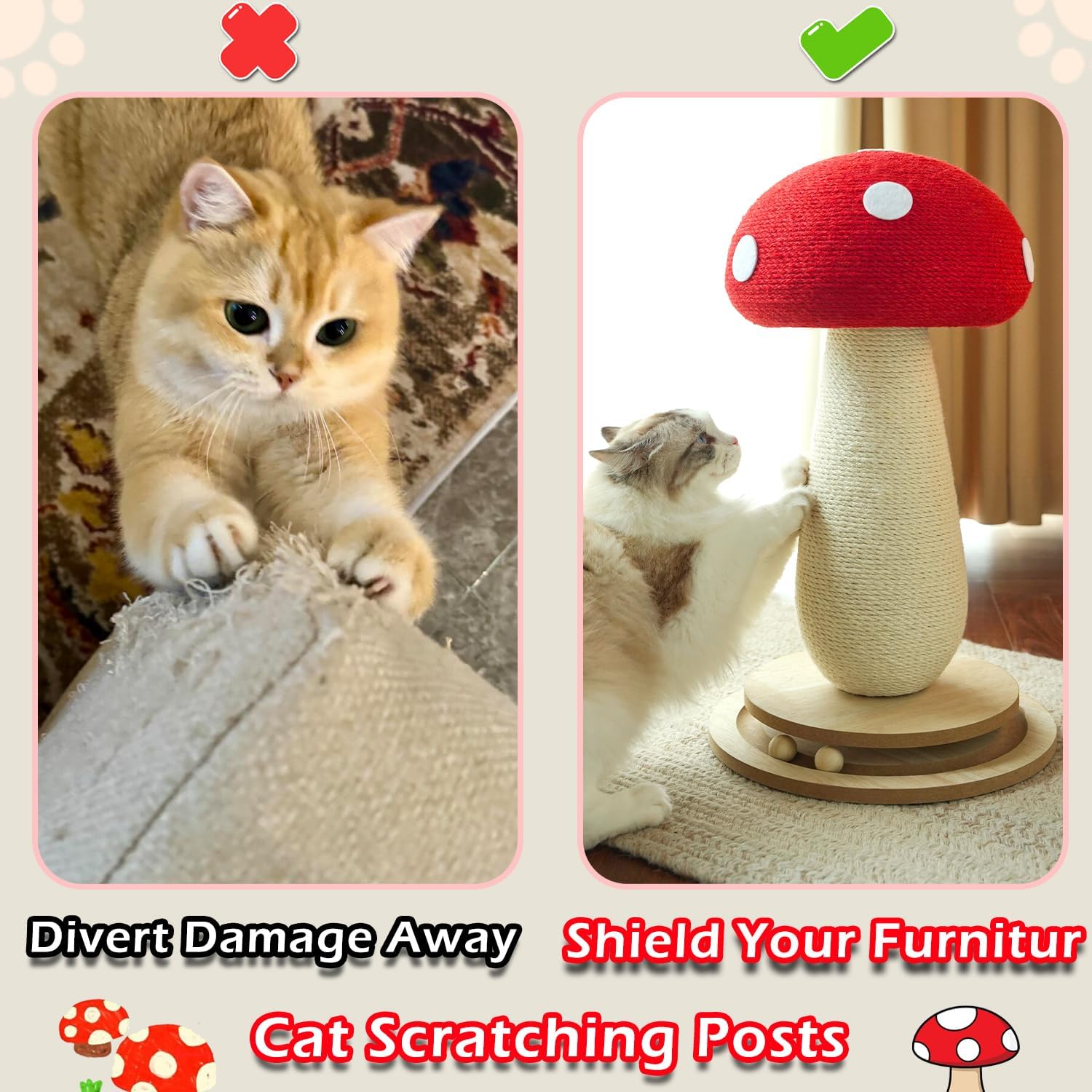 - 【Full-Body Natural Sisal for Instinctive Scratching & Furniture Protection】Top mushroom cap & center post wrapped in premium natural sisal - chosen for extreme durability and superior texture to satisfy scratching instincts 24/7; Permanently protects sofas/carpets