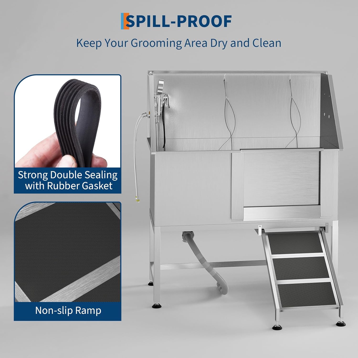- Safety-Equipped Wash Tub Includes non-slip access ramp, storage cabinet, and locking gate mechanism to secure pets during bathing procedures.